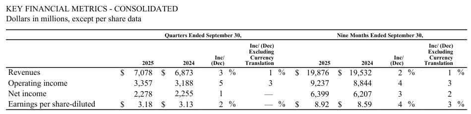 | | | Quarters Ended September 30, | | Inc/ (Dec) | | | Nine Months Ended September 30, | | Inc/ (Dec) | | --- | --- | --- | --- | --- | --- | --- | --- | --- | --- | | | 2025 | 2024 | Inc (Dec) | Excluding Currency Translation | | 2025 | 2024 | Inc/ (Dec) | Excluding Currency Translation | | Revenues | 7.078 | 6.873 | 3 % | | 0/0 | 19.876 | 19.532 | 2 % | 0/0 | | Operating income | 3,357 | 3.188 | | | | 9,237 | 8.844 | 4 | 3 | | Net income | 2,278 | 2,255 | | | | 6.399 | 6.207 | | 2 | | Earnings per share- ...