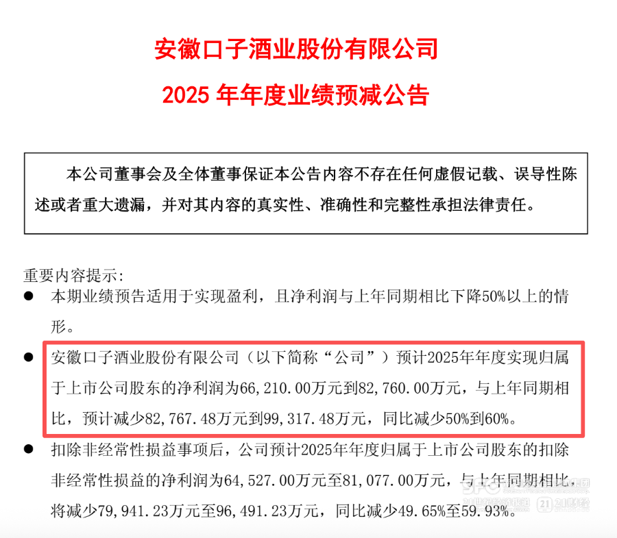 记者丨肖夏 编辑丨高梦阳 视频丨柳润瑛 白酒股首份年度业绩出炉。 1月7日傍晚,口子窖披露2025年年度业绩预减公告:预计2025年年度实现归母净利润为6.62亿 元至8.28亿元, 与上年同期相比预计同比减少50%到60%。 21世纪经济报道记者注意到,按照披露的预计净利润, 口子窖去年四季度的归母净利润同比 大幅缩减,甚至可能出现了亏损。 去年前三季度,口子窖的归母净利润是7.42亿元。对比三季 报,口子窖利润下滑幅度进一步加大。 口子窖将盈利大幅下降归因于需求下行和政策影响。 "主要系报告期内白酒行业市场分化与渠道变革加剧,叠加需求下行及政策变化影响,核心利 润来源高端窖产品销量大幅下滑,导致营业收入减少,同时为保证公司运营及市场持续投入, 管理费用、销售费用下降幅度均小于营业收入下降幅度致利润总额下降幅度较大。"口子窖在 业绩预告中表示。 正如业绩预告所言, 高档白酒严重下滑,直接压制了利润空间。 2025年前三季度,口子窖的高档白酒销售收入29.6亿元,同比下滑近28%,相比去年上半年加 速下滑,此外中档白酒下滑速度也在加快。 口子窖并未提及营收指标,但从前三季度收入和全年盈利跌幅来看,全年营收大概 ...