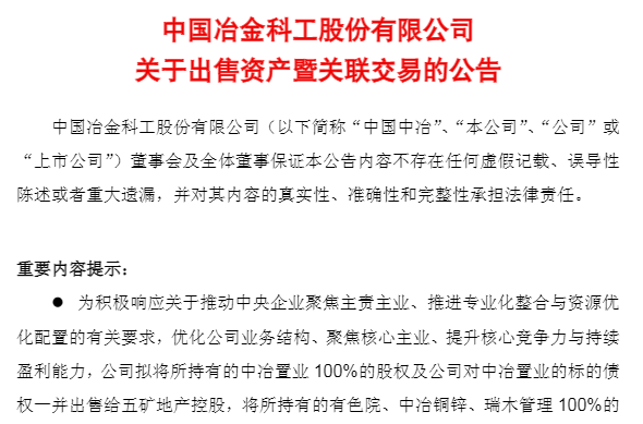 中国中冶低开近6% 拟607亿元出售中冶置业、中冶铜锌等资产