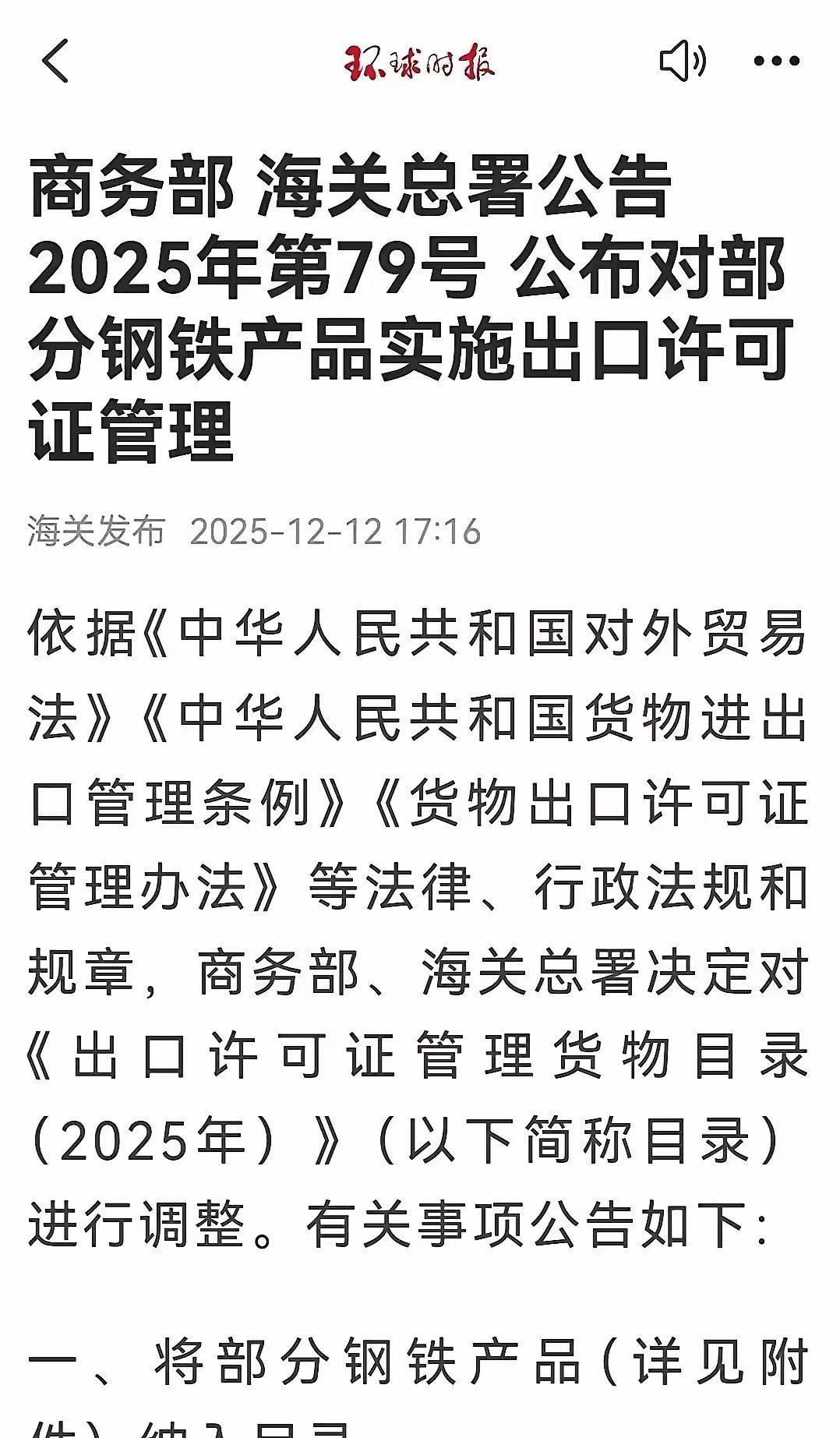 近日,商务部宣布中国对部分钢铁产品实行出口许可管理!什么意思?就是要限制钢铁出口!这招棋下得稳准狠!很多人没看懂,以为咱们在退缩。恰 恰相反,这是把拳头收回来,为了更有力地打出去。 中国钢铁产量占全球一半以上。去年粗钢产量突破10亿吨,出口钢材近8000万吨。这数字意味着什么?全球市场每两吨钢材里,就有一吨贴着中国标 签。 过去咱们拼命出口,赚的是辛苦钱。一吨钢材利润薄得像张纸,污染和能耗却留在了自家后院。这种赔本买卖,早该停停了。 出口许可管理不是不出口,而是聪明地出口。该出口的高附加值产品照样出去,那些高耗能、低效益的粗钢得好好管管。这叫腾笼换鸟,逼着产业升 级。 国际市场上有些人慌了。欧美钢价应声上涨,期货市场一片飘红。他们突然发现,离开中国钢铁,自己的基建和制造业可能真要卡壳。 国内钢厂得换个活法了。别再指望靠出口退税那点甜头,得老老实实提升技术含量。特种钢、高端板材这些才是未来,粗钢白菜价的时代该翻篇了。 想想也挺有意思。当年他们用反倾销、加关税卡我们脖子,现在咱们用市场手段调整出口结构,他们反而受不了。市场规律这东西,果然谁用得好谁占 便宜。 环保账也得算清楚。钢铁行业碳排放占全国总量15%以上。 ...