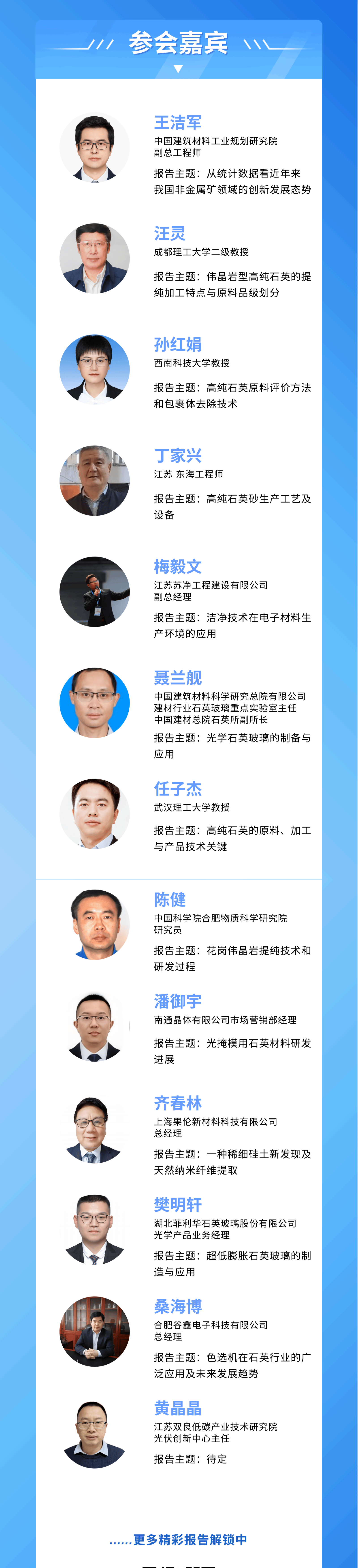 近年来,石英材料作为半导体、光伏、光通信、航空航天等战略性新兴产业的关键基础材料,其市场需求持续增长,行业也正处于快速发展与结构转型的关 键时期。 目前,石英行业呈现出明显的结构性分化。在光伏领域,由于前期产能扩张迅速,面临阶段性供需失衡,部分企业利润承压。与之形成对比的 是,半导体、光纤通信领域对高纯石英材料的需求持续旺盛,成为行业盈利的核心支撑。 因此,突破高端产品技术壁垒、实现半导体石英器件的国产化替代、以及满足终端应用不断变化的新需求,已成为全行业共同关注的焦点。在此背景下,由 弘燊石英产业大会组织的"2026第六届安徽国际石英产业大会"于2026年3月18日(3月17日报到)在合肥滨湖富茂大饭店召开。 此次大会旨在为石英产业链各方搭建一个高效的交流与合作平台,大会以"高效、精准、融合"为主题,共同探讨矿产勘探、前沿提纯技术、高端产品开发与 终端应用拓展等核心议题,携手促进我国石英产业的技术创新与高质量发展。大会热诚欢迎国内石英业界专家学者、企业代表、技术人员积极参会。 参会嘉宾 孙红娟 西南科技大学教授 报告主题: 高纯石英 和包裹体去除技术 江苏 东海工程师 报告主题: 高纯石英 设备 電影 江苏 ...