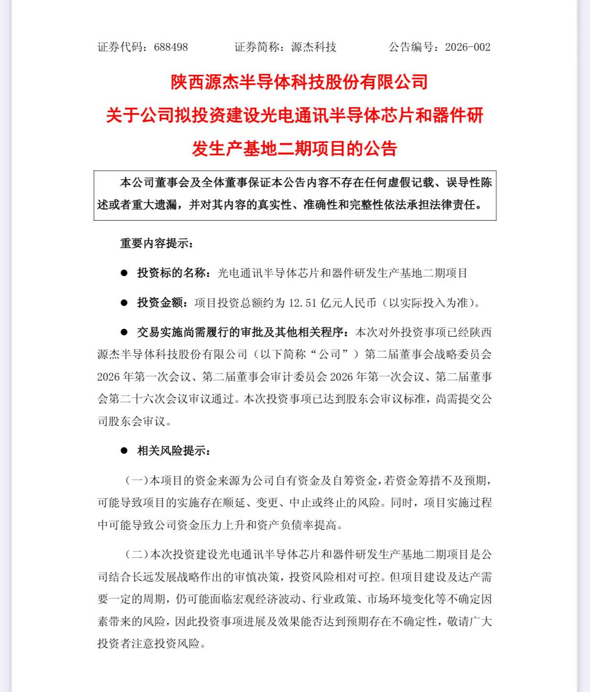 源杰科技:拟12.51亿元投建光电通讯半导体芯片和器件研发生产基地二期项目 项目聚焦高速光芯片领域