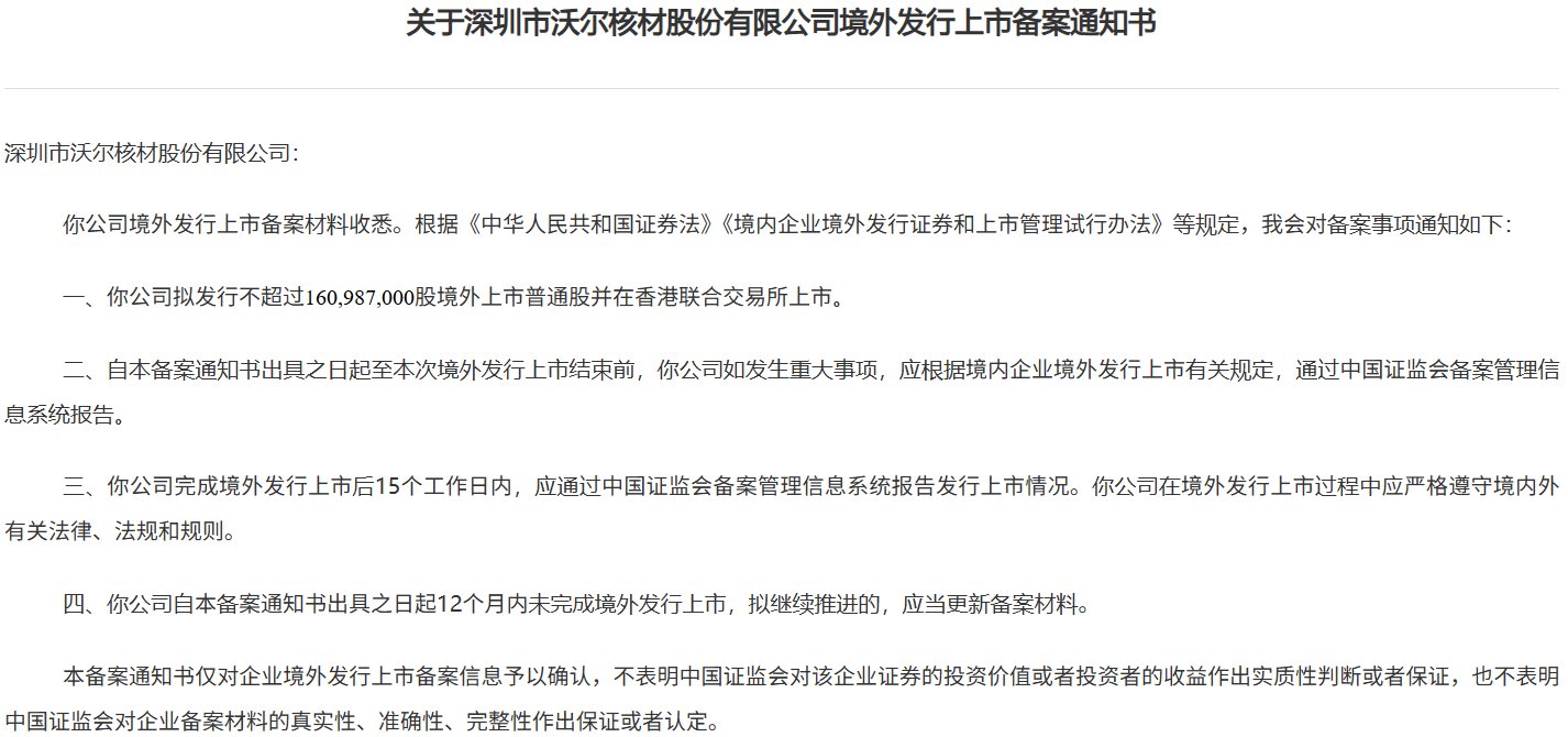 新股消息 | 沃尔核材港股IPO获中国证监会备案