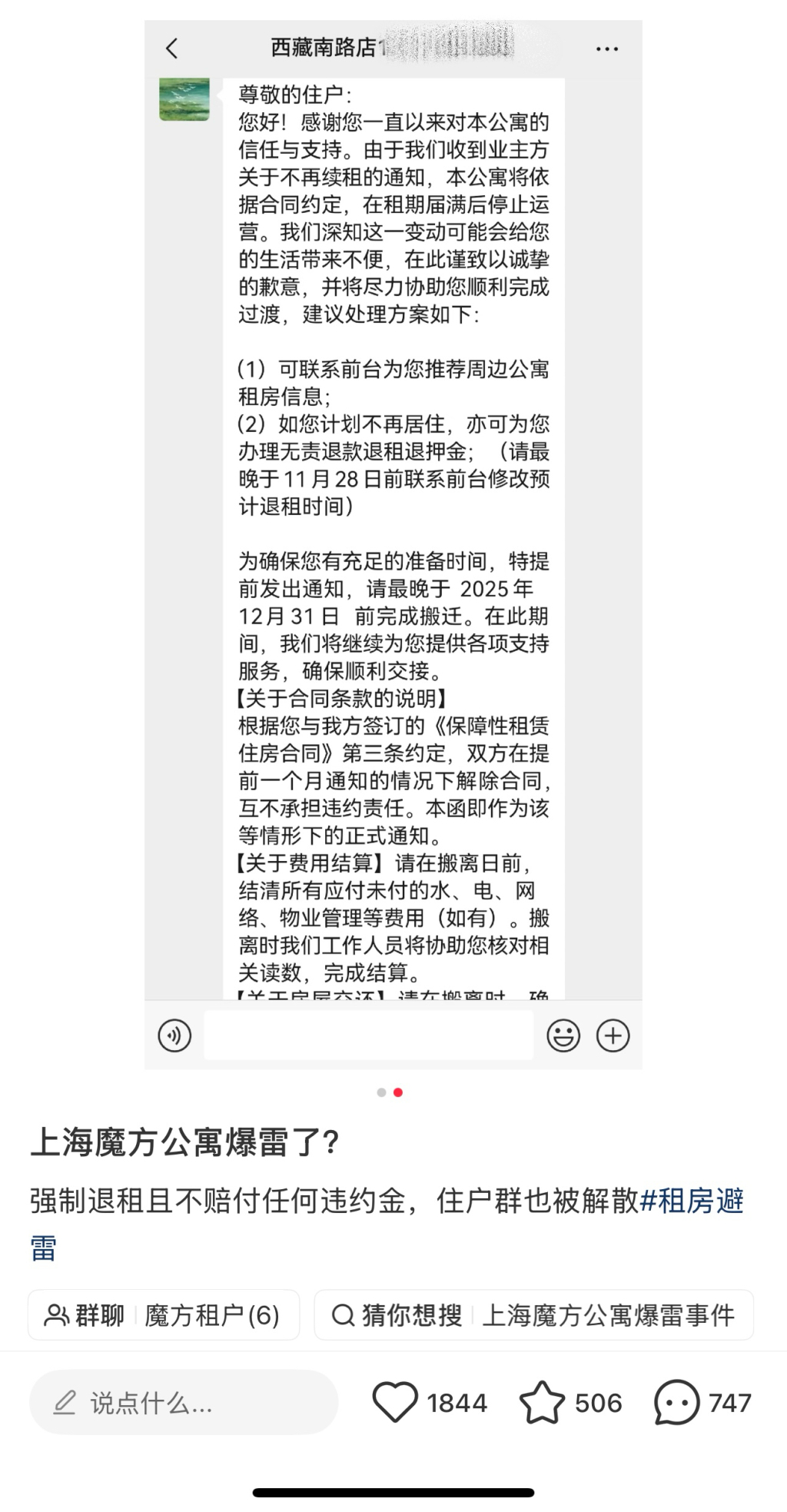 近日,有网友在社交平台反映,魔方公寓上海西藏南路店要求租户于2025年12月31日前完成搬离,相关住户群也被解散,仅能通过客服一对一沟 通,部分网友因此质疑平台"暴雷",并提出违约金支付诉求。 据了解,此次产生争议的西藏南路门店系魔方公寓以第三方托管模式经营,委托方为上海翰昌物业管理有限公司(甲方)。据魔方生活提供的一 份《保底托管经营协议》,甲方将位于上海市黄浦区制造局路833弄26号楼内的米寓国际青年社区黄浦滨江店,含经营资质、经营场地及经营场所 内全部经营资产托管给魔方(中国)投资有限公司经营。托管内容包括运营房间204间,辅助房间5间等。托管期限及交付时间为:自2019年11月1 日为实际交接日,至2025年12月31日止。 此外,也有网友在社交平台发文反映,"魔方公寓上海火车站店要求租客办理租赁合同转让及解除手续",另有IP地址显示为杭州等地的租客同步 反馈,存在"房子租赁期限未到,却被要求突然搬走"等情况。 告知书同步发布了处理方案,称可联系前台推荐周边公寓租房信息;若计划不再居住,亦可办理无责退款退租退押金。在此期间,将继续提供各 项支持服务,确保顺利交接。 对于租户质疑的"强制退租"及违约金争 ...
