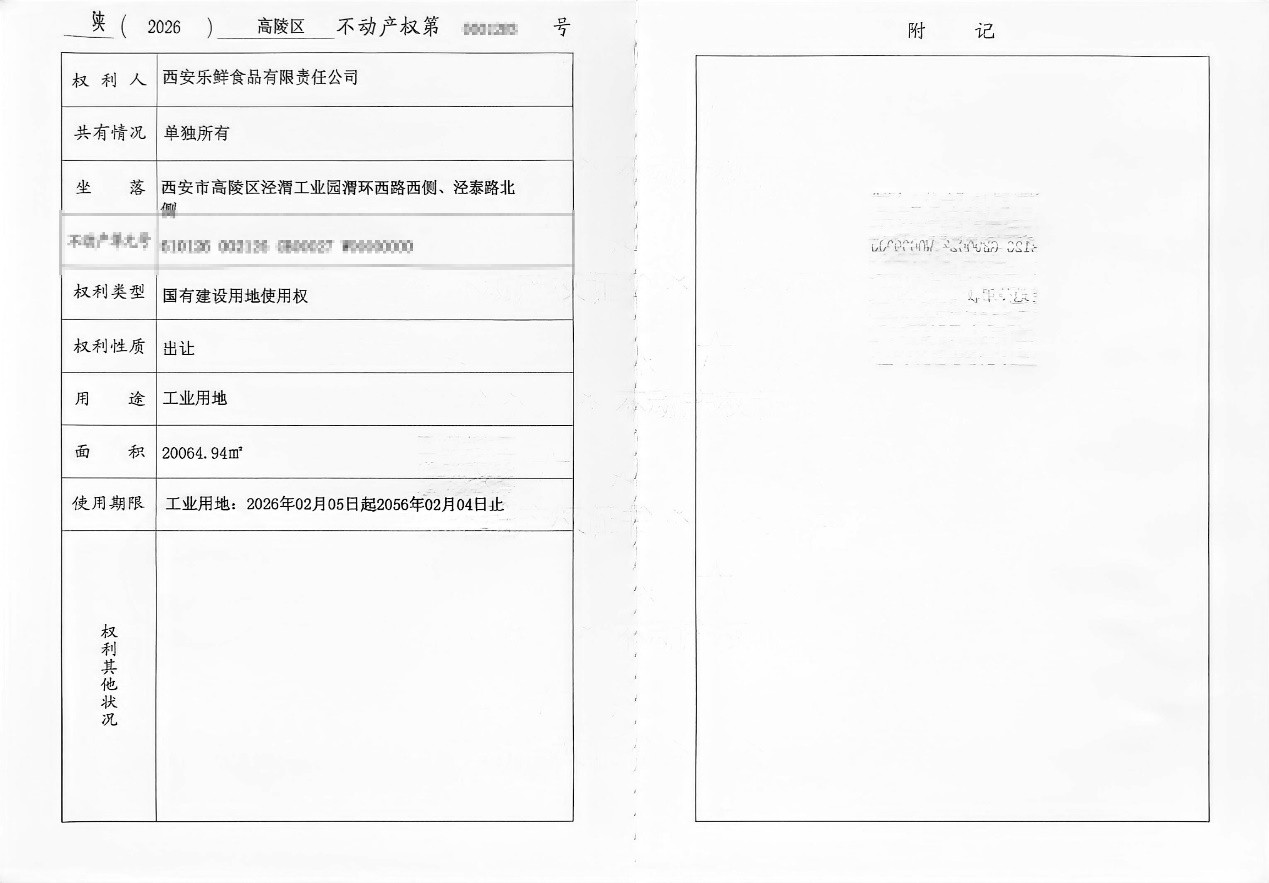 这一战略布局的背后,是食大事对区域产业生态的深度考量与精准赋能。自2023年启动战略升级以来,集团围绕供应链体系接连完成资源整合与产能扩容, 形成了成熟的产业运营逻辑。此次新建的智慧工厂将进一步释放聚合效能:既为本地食材种植、加工等上游产业提供稳定市场,也为下游零售、餐饮企业提 供标准化服务,助力政府完善区域产业生态布局。 多维布局显匠心 劲燃产业新引擎 2026年刚开年,西安本土龙头餐食企业——西安食大事控股有限责任公司(简称"食大事")顺利取得致味乐鲜鲜食智慧工厂项目土地证,这标志着该项目即 将在经开区泾渭新城正式启动。该项目总投资3亿元、规划占地30.09亩,不仅是集团深耕鲜食产业战略升级的关键一步,更以"产学研深度融合+全产业链条 布局"的核心优势,为区域经济增长、产业升级注入多重动能,在先进制造业和现代服务业融合发展上创出新模式,为地方高质量发展提供坚实支撑。 | के | 2026 | 高陵区 不动产权第 0001283 | 号 | 附 记 | | --- | --- | --- | --- | --- | | 权利人 | | 西安乐鲜食品有限责任公司 | | | | 共有情况 | | 单独所有 ...