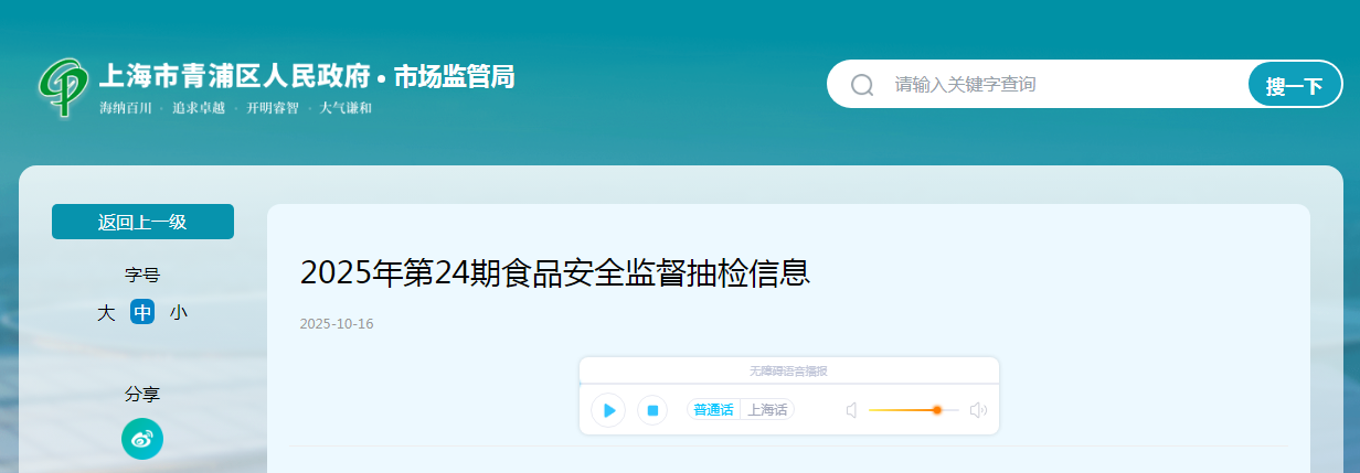 上海市青浦区市场监督管理局2025年第24期食品安全监督抽检信息