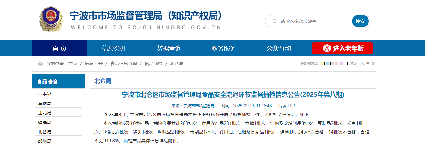 宁波市北仑区市场监督管理局食品安全流通环节监督抽检信息公告(2025年第八期)