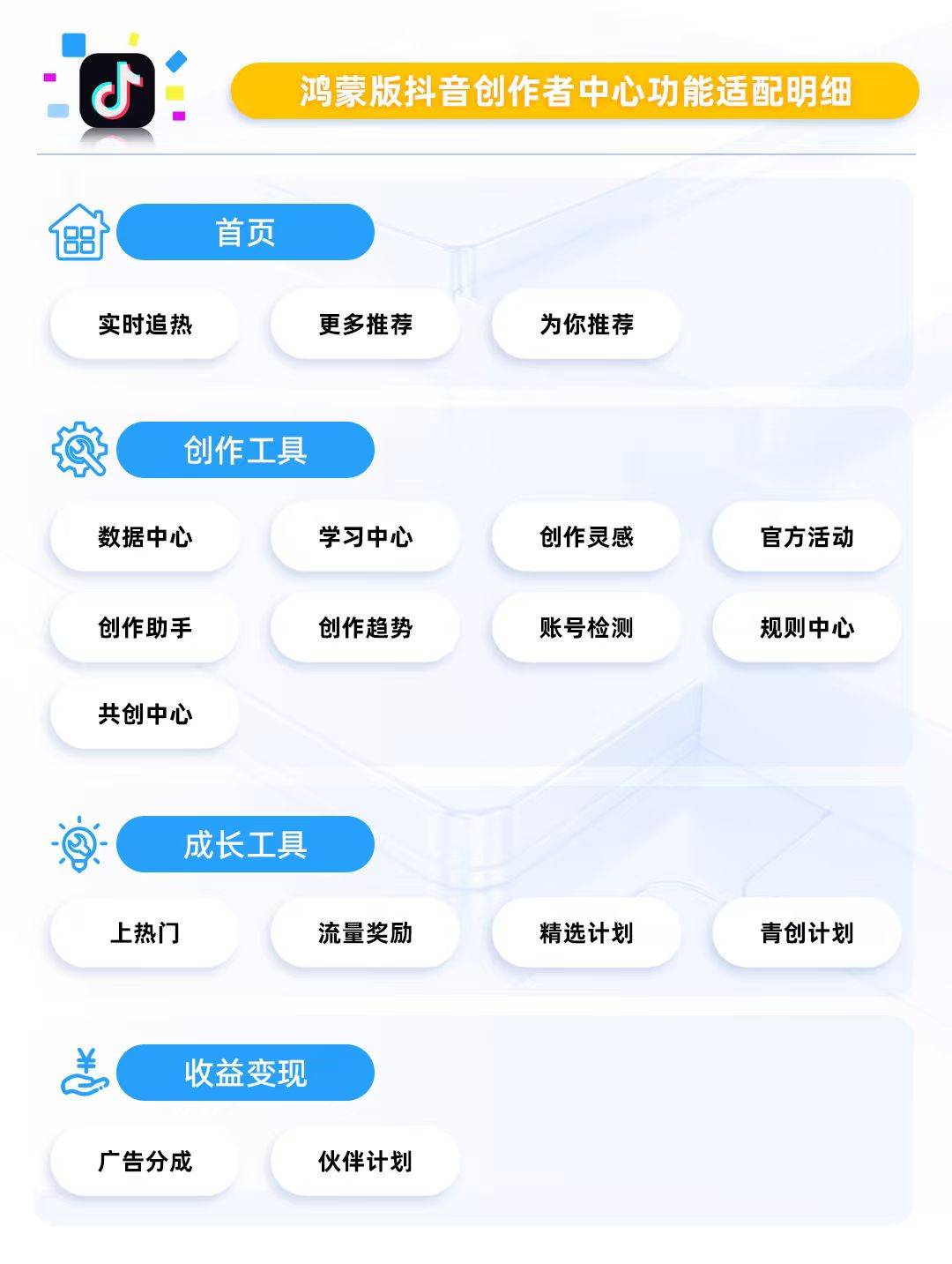 对于想把流量变成实际收益的创作者,鸿蒙版抖音同样给力。成长工具里的"上热门"和"流量奖励",能直接为优质内容争取更多曝光,让内容先被看到。 除了聚焦内容曝光,平台还针对不同类型创作者提供专项支持 ——"精选计划"和"青创计划"可提供额外扶持,不管是新人创作者还是垂直领域达人,都 能找到适配的助力。而到了流量变现环节"广告分成"和"伙伴计划"则能直接把播放量转化为真金白银,让每一份努力都有回报。 相比抖音的短视频属性,小红书更偏向图文和生活分享,鸿蒙版小红书的创作者中心也围绕这个特点做了优化。 首页的数据中心设计得很直观,笔记阅读量、点赞收藏、粉丝增长情况都能快速查看,帮你了解哪类内容更受欢迎。对于创作困难户来说,灵感创作板块 是块"宝地",它可以帮助新手快速找到适合自己的内容方向和表达风格,不至于盲目摸索。 做内容创作的朋友都懂,一个好用的创作者中心有多重要。最近体验了鸿蒙版抖音和小红书的创作者中发现,像选题灵感、创作工具、流量扶持、收益变 现等等这些高频用到的核心功能都齐了,基本可以满足日常创作需求。对于鸿蒙用户来说,这意味着创作体验正在加速追上其他平台,鸿蒙5用户的创作 体验越来越完善了。 打开鸿蒙版抖音 ...