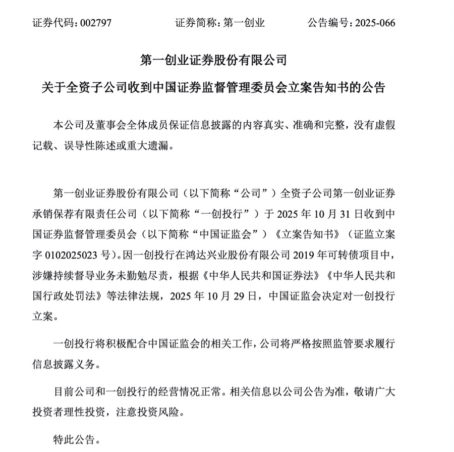 10月31日晚间,第一创业公告,第一创业全资子公司第一创业证券承销保荐有限责任公司(以下简称"一创投行")于2025年10月31日收到中国证监会《立 案告知书》(证监立案字0102025023号)。因一创投行在鸿达兴业股份有限公司(简称"鸿达兴业")2019年可转债项目中,涉嫌持续督导业务未勤勉尽 责,中国证监会决定对一创投行立案。 去年5月,一创投行就发布过关于鸿达兴业回售违约风险的提示性公告,表示主办券商认为鸿达兴业持续经营能力存在重大不确定性,并提醒广大投资者 关注可转债回售无法兑付的违约风险。 业内人士认为,投行的责任并非随着项目发行而结束,而是贯穿于整个存续期。资深投行人士王骥跃接受上证报采访表示:"鸿达兴业已经退市了,但对 中介机构的追责还未结束。这一案例体现了监管对压严压实保荐机构持续督导履职责任的监管导向,也警示其他券商要切实做好持续督导工作,避免重保 荐、轻督导的情况。" 一创投行曾发布鸿达兴业回售违约风险 10月31日晚间,第一创业公告,全资子公司一创投行在鸿达兴业股份有限公司2019年可转债项目中,涉嫌持续督导业务未勤勉尽责,中国证监会决定对一 创投行立案。 第一创业表示,一创投行将积极 ...