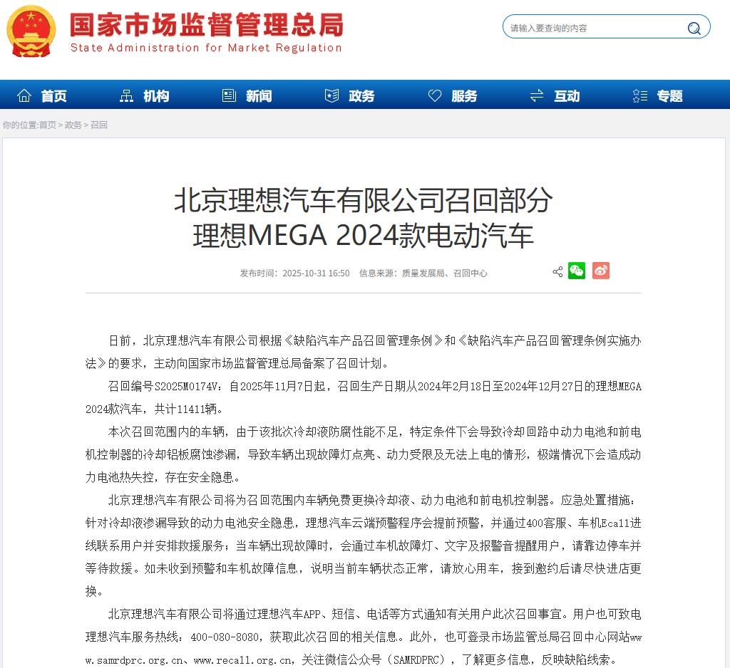召回事件概述 - 理想汽车主动召回11411辆生产日期在2024年2月18日至2024年12月27日之间的理想MEGA 2024款汽车 [1][2] - 召回计划自2025年11月7日起执行,召回编号为S2025M0174V [2] - 召回原因为特定批次车辆冷却液防腐性能不足,可能导致冷却回路中的动力电池和前电机控制器冷却铝板腐蚀渗漏 [2] 技术问题与风险 - 冷却液渗漏可能导致车辆故障灯点亮、动力受限及无法上电,极端情况下存在动力电池热失控的安全隐患 [2] - 2024年12月28日后生产的理想MEGA车型无此风险,理想汽车其他车型也不存在该问题 [4] - 公司将为召回范围内车辆免费更换冷却液、动力电池和前电机控制器 [3] 应急处置措施 - 公司通过云端预警程序对冷却液渗漏导致的动力电池安全隐患进行提前预警,并通过400客服、车机Ecall联系用户安排救援 [3] - 车辆出现故障时,会通过车机故障灯、文字及报警音提醒用户靠边停车等待救援 [4] - 公司表示未收到预警和故障信息的车辆状态正常,可放心使用,但接到邀约后应尽快进店更换 [4] 产品与供应链信息 - 理想MEGA于2024年3月1日上市,上市指导价为55.98万元 [4] - 该车型搭载“理想—宁德时代 麒麟5C电池”,电池容量为102.7kWh,CLTC续航里程为710公里 [4] - 除理想汽车外,小米汽车、极氪汽车、问界等多家车企的部分新能源车型也搭载宁德时代的麒麟电池 [4]