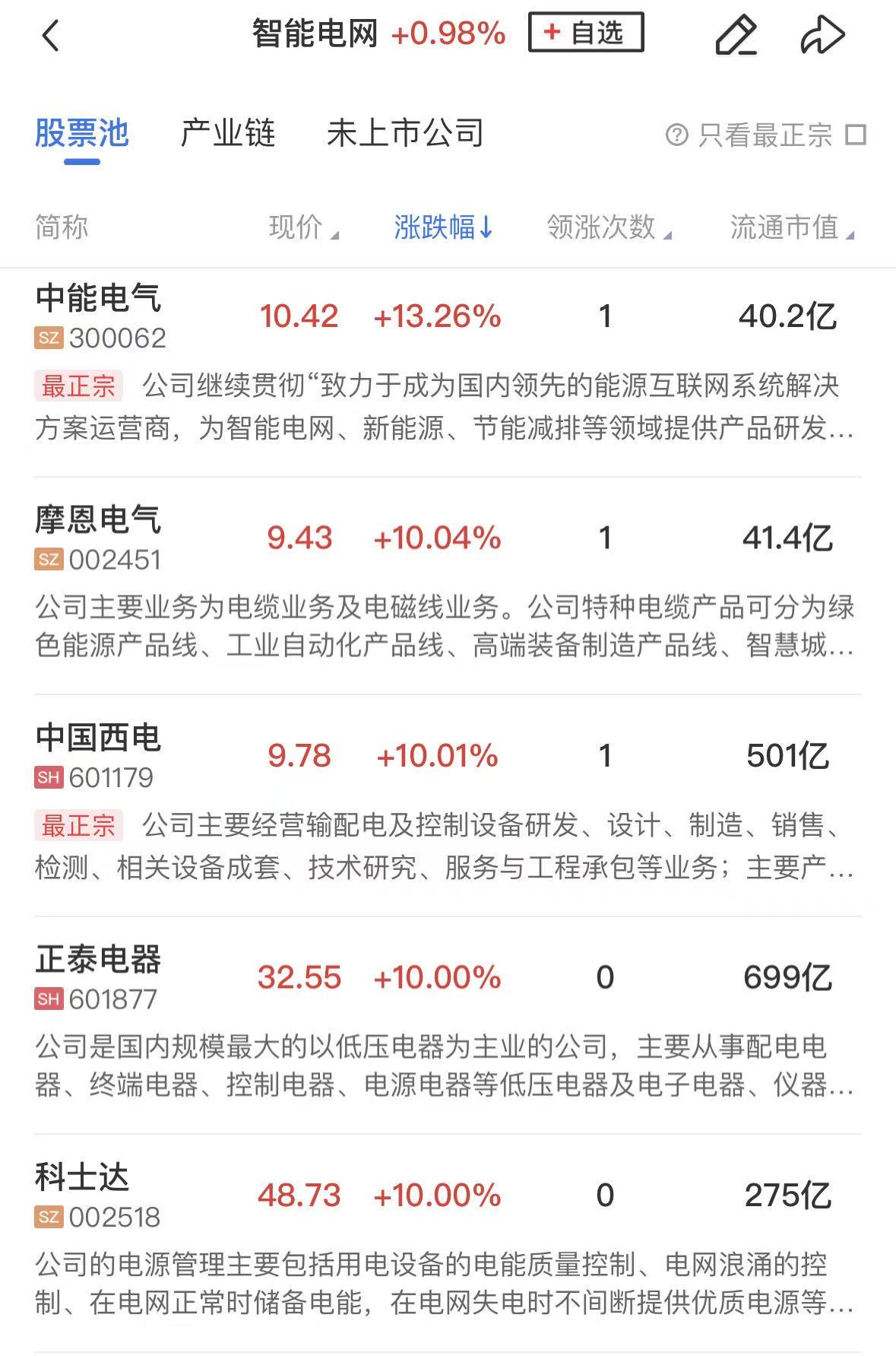 公司是国内规模最大的以低压电器为主业的公司,主要从事配电电 器、终端电器、控制电器、电源电器等低压电器及电子电器、仪器, 智通财经11月6日讯,市场早盘震荡拉升,沪指涨近1%,重回4000点上方,科创50指数涨近3%。沪深两市半日成交额1.32万亿,较上个交易日放量1880亿。 盘面上热点快速轮动,电网设备板块延续强势,摩恩电气3连板,保变电气一字涨停2连板。半导体板块震荡拉升,德明利涨停,海光信息盘中涨超10%。化 工板块爆发,芭田股份、澄星股份等多股涨停。电解铝概念表现活跃,中国铝业涨停创15年新高。燃气轮机概念持续走高,三角防务20cm涨停,全柴动 力、潍柴重机等多股涨停。下跌方面,旅游板块集体下挫,冰雪产业概念股领跌,大连圣亚跌停。截至收盘,沪指涨0.88%,深成指涨1.39%,创业板指涨 1.39%。 个股来看,今日早盘涨停数量为47家(不包括ST及未开板新股),封板率为71%,连板股数量为11家,海陆重工4连板,闽东电力、摩恩电气3连板,顺钠股 份、和展能源、洪兴股份、太阳电缆、常宝股份、恒大高新、保变电气、联德股份2连板。 板块上,电网设备板块延续强势,摩恩电气3连板,中国西电、正泰电器、保变电 ...