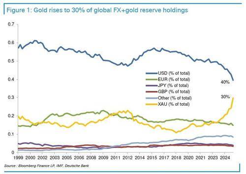 黄金在全球央行储备中的地位正在发生历史性转变。截至目前,黄金占全球外汇储备加黄金总资产的比 例已突破30%,而美元占比则降至40%。 根据德意志银行最新测算,若金价突破每盎司5790美元,黄金将与美元在全球储备中平分秋色,各占 36%,实现历史性超越。这一价格仅比当前水平高出约33%。 过去六个月金价的强劲上涨已将黄金储备占比从24%推升至30%,同期美元占比从43%降至40%。世界 黄金协会今年的调查显示,43%的央行计划增持黄金,高于上年的29%,95%的储备管理者预计未来12 个月全球央行黄金持有量将上升。 央行增持意愿持续走强 早在今年7月,德意志银行就曾探讨央行购金是否会成为金价的制约因素。当时的结论是否定的。数据 显示,央行对黄金的偏好只增不减。 这一趋势自2022年美国因俄乌冲突将美元武器化后加速,当时各国央行以55年来最快速度增持黄金。对 于投资者而言,央行持续增持意味着金价获得长期支撑,而美元在全球储备体系中的主导地位正面临结 构性挑战。 黄金储备占比六个月飙升6个百分点 德意志银行分析师Michael Hsueh上周五更新的数据显示,按当前现货金价计算,黄金占全球外汇加黄 金储备的比例已从 ...
