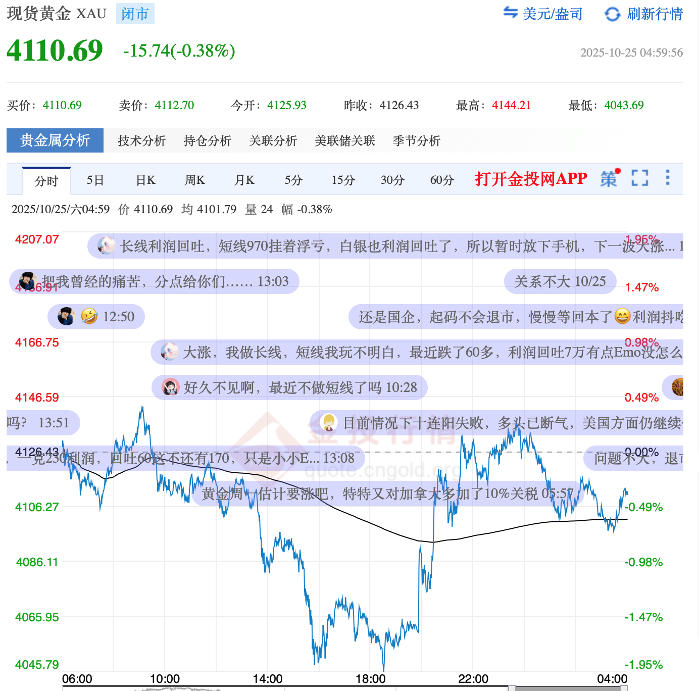 黄金价格表现 - 10月25日现货金价盘中一度下探至4044美元/盎司,单日跌幅达0.38%,较国庆高点回落幅度显著 [1] - 国际金价持续高位震荡 [1] - 部分知名投行看涨金价至4900美元/盎司(约合人民币1100元/克) [14] - 某银行内部研报判断黄金每克千元价位已是高位 [14]   黄金消费市场情况 - 国内重要黄金集散地水贝市场呈现热销景象,消费端热情不减 [1] - 即便是工作日下午,水贝黄金市场不少商铺前依然人流簇拥,客户包括外地客、外籍客户和家庭消费客户 [4] - 近期客户买入情绪明显高于卖出意愿,有的顾客带着预算目的明确,一次就买好几件 [7] - 金包银饰品商户推出优惠活动,例如一口价9折,按克重手工费5折,吸引消费者 [10]   黄金投资策略与银行产品 - 多家银行理财经理建议客户采取定投策略,将黄金作为资产配置的一部分长期持有,而非进行短期投机 [3] - 银行更重视引导投资者的风险管控意识,建议投资者心态从短期套利转向长期主义的理性配置 [14] - 某银行曾在国内期货金价970元价位建议客户止盈离场 [14] - 建议客户将黄金配置控制在总资产的10%以内 [14] - 多家银行正在大力推广黄金积存业务,该产品在赎回时可实现秒级到账,相比部分机构的T+1更具灵活性 [14][18] - 黄金积存是指定期或主动购入黄金份额的投资方式,投资者能在金价下跌时加大投入,也能在金价上涨时适当减量 [18]   投资者行为变化 - 国庆金价暴涨期间,投资者的买入热情空前高涨,有高净值客户买入了几千万的黄金理财产品 [14] - 随着金价出现高位震荡,投资者心态更趋谨慎 [3][14] - 近期金价高位回调以来,尚未见投资者集体恐慌抛售情绪 [14]