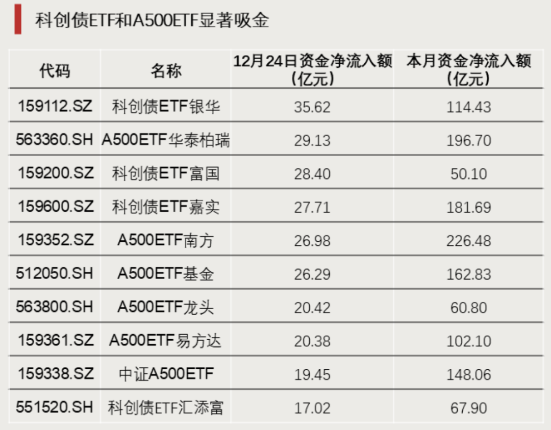 01 12月24日,多只科创债ETF和A500ETF显著"吸金"。本月以来,A500ETF获资金大举增持,规模最大的A500ETF华泰柏瑞(563360)已连续11个交易日规 模创历史新高。 02 12月25日,商业航天概念持续活跃,卫星主题ETF领涨。黄金股主题ETF跌幅居前。 03 12月25日,市场交投活跃,2只A500ETF成交额再次超过100亿元。 多只A500ETF持续"吸金" 12月24日,多只科创债ETF和A500ETF显著"吸金"。 本月以来,A500ETF华泰柏瑞(563360)、A500ETF基金(512050)、中证A500ETF(159338)、A500ETF易方达(159361)等规模较大的A500ETF获资 金大举增持,资金净流入额均超过100亿元,其中,A500ETF南方(159352)本月资金净流入额超过200亿元。 在巨量资金持续涌入的背景下,多只A500ETF规模不断创历史新高。例如,Wind数据显示,规模最大的A500ETF华泰柏瑞(563360)自12月10日至12月 24日,已连续11个交易日规模创历史新高。 | 代码 | 名称 | 12月24日资金净流入额 本月资 ...