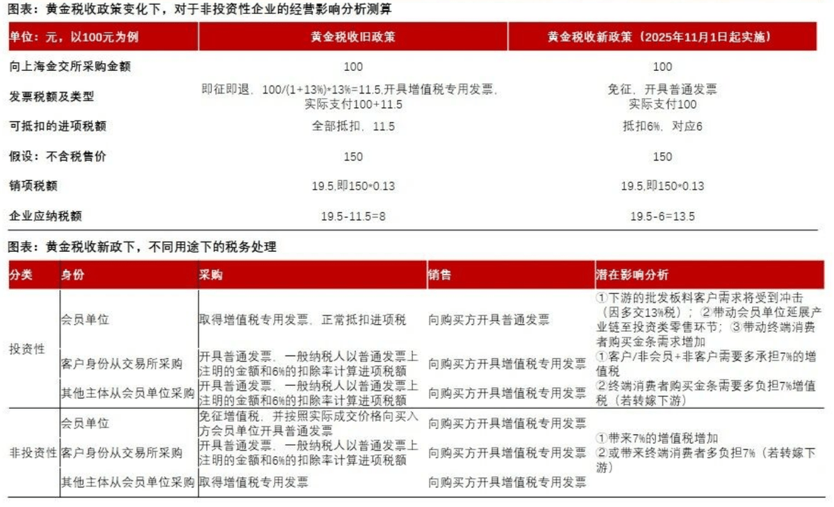 黄金税收新政发布,关注黄金基金ETF(518800)——交易所渠道投资黄金免征增值税,关注流通规模超250亿的黄金基金ETF(518800)。 财政部和国家税务总局发布《关于黄金有关税收政策的公告》,该政策于2025年11月1日起实施。 核心变化 黄金实物交割出货情况下、对于投资类(金条等)和非投资类(饰品、工业等)进行分类管理: 投资类:以会员身份向上海黄金交易所采购环节的税收优惠政策不变,但后续销售环节只能向购买者开具普通发票,无法抵扣进项税; 非投资类:从"增值税即征即退+开设增值税专票"到"增值税免税+开设普票+6%计算抵扣",进项税抵扣减少(从13%至6%)但减少资金占用。 对于非投资类的黄金饰品企业:因进项税抵扣减少(由13%降至6%,详见附录图片),对于成本端或有所提升。 对于投资金类销售的企业:会员单位(截止25年9月,共计304家,多为银行、券商、大型珠宝零售公司、大型黄金公司)在采购环节可抵扣进项税、销售金 币具备优势; 对于终端消费者:购买黄金饰品价格或将提升(具体提升幅度取决于黄金饰品企业的成本转移幅度);向金交所会员单位购买金条不受影响。 投资观点 今年针对黄金交易政策频出。继8月1 ...