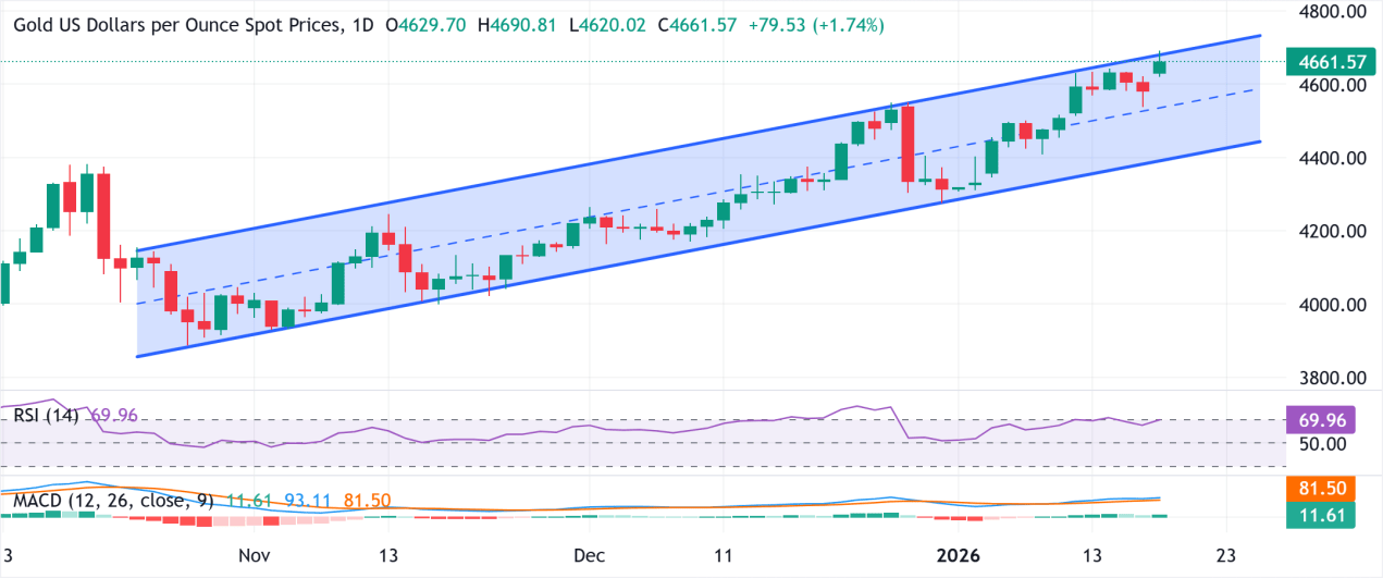 黄金市场当前状态 - 黄金价格在历史高位区域整理,接近4600美元/盎司,未出现明确突破或回调信号 [1] - 市场整体偏向看涨,但多头动能收敛,交易员观望等待美国消费者通胀数据指引方向 [1][2] 核心影响因素分析 - 美联储政策路径不确定性主导黄金与美元走势,市场预期美联储年内将实施两次降息 [2] - 即将发布的美国12月CPI数据为核心风向标,市场普遍预期整体CPI环比上涨0.3%,同比维持2.7%,核心CPI同比或微升至2.7% [2] - 若通胀数据显著偏离预期,将改变市场对美联储1月28日议息会议的调整预期,引发剧烈波动 [3] - 通胀高于预期或削弱降息预期,推动美元走强压制黄金;数据低于预期则强化降息预期,打压美元助力黄金上行 [4] 技术面分析 - 黄金处于明确上升通道内,通道依托3920.24美元/盎司低点形成,上轨阻力区间在4650-4656美元/盎司 [4] - 50日简单移动平均线持续上行,位于4255.80美元/盎司,构成短期重要支撑位,金价稳定运行于均线上方凸显买盘倾向 [4] - 移动平均收敛发散指标线位于信号线之上,处于正值区域,正向柱状图扩大,显示上涨动能持续增强 [6] - 相对强弱指数当前读数70.26,进入超买区域,可能限制金价向通道上轨攀升,短期内存在技术性回调可能 [6]
