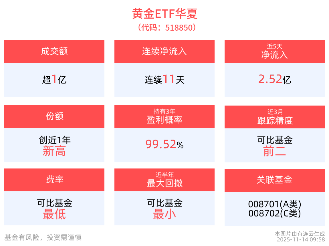 费率方面,黄金ETF华夏管理费率为0.15%,托管费率为0.05%。 黄金ETF华夏(518850),场外联接(华夏黄金ETF联接A:008701;华夏黄金ETF联接C:008702)。 以上内容与数据,与有连云立场无关,不构成投资建议。据此操作,风险自担。 截至2025年11月14日 09:58,黄金ETF华夏(518850)下跌0.47%,最新报价9.19元。拉长时间看,截至2025年11月13日,黄金ETF华夏今年以来累计上涨超 54%。 统计显示,黄金ETF华夏(518850)近11天获得连续资金净流入,合计"吸金"5.39亿元,截至11月13日,黄金ETF华夏最新份额达9.8亿份,最新规模90.47亿 元,均创成立以来新高。 截至11月13日,黄金ETF华夏近2年净值上涨102.41%,排名可比基金第一,贵金属基金排名1/45,居于前2.22%。从收益能力看,截至2025年11月13日,黄 金ETF华夏自成立以来,最高单月回报为11.49%,最长连涨月数为6个月,最长连涨涨幅为16.34%,涨跌月数比为42/24,上涨月份平均收益率为3.37%,年 盈利百分比为75.00%,月盈利概率为63.43% ...