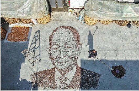 在山东省滨州市惠民县胡集镇一个农家院里,一名年轻人蹲在地上,手里攥着黑小麦粒,将最后几把麦子撒 在水泥地面上。从高处俯瞰,一幅十多平方米的袁隆平院士肖像赫然呈现,麦粒铺就的发丝根根分明,眼角 的纹路与和蔼的笑容栩栩如生。这个生于1992年的农村小伙名叫赵同恺,他用了五个多小时,以最朴素的 粮食作画,完成了一场独特的致敬。 文/片/视频 记者 王鑫 滨州报道 t 12 The September and and a 2 19 40 t 20 65 ct 6 the state 87 (43 r 1 4 赵同恺的父亲是村里的木匠,做家具时总喜欢在橱柜、玻璃上画些"松鹤延年"之类的图案。受父亲影响, 他的绘画天赋很早就显露出来,上幼儿园时,他就拿着画笔看到什么画什么。一年级成为美术课代表,学校 的每次绘画比赛都是一等奖,黑板报更是他的专属舞台。十六岁时他学了机电一体化,十八岁外出打工。 不到两年,他深感那并非自己想要的生活,"还是想用画画来赚钱养家"。 2013年,赵同恺找到了方向,报名参加了墙体彩绘培训班。从此,他扛起颜料桶,奔走于城乡之间,画装饰 画、文化墙,一画就是七年。2020年,他尝试做些小生意,直到短视 ...