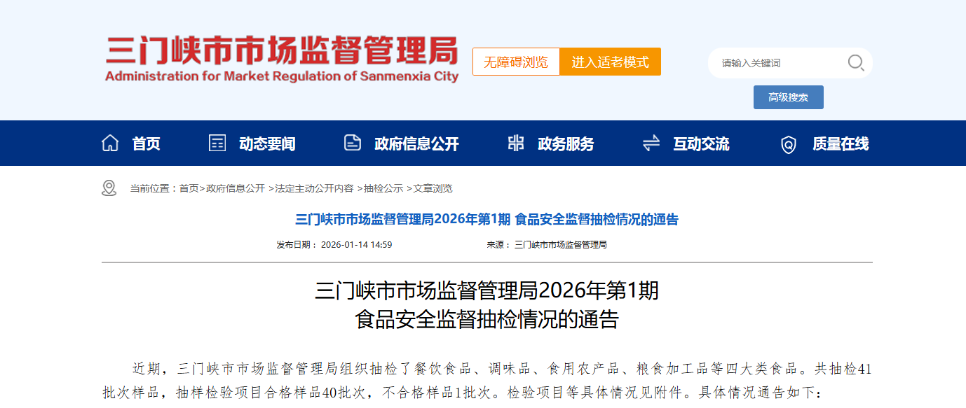 河南省三门峡市市场监督管理局2026年第1期食品安全监督抽检情况的通告