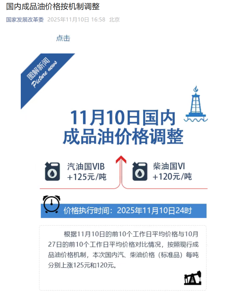 油价调整核心信息 - 国内汽、柴油价格迎来年内第七次上调 执行时间为2025年11月10日24时 汽、柴油价格每吨分别上涨125元、120元 [2] - 折合升价后92号汽油、95号汽油、0号柴油均上涨0.10元 加满一箱50L油箱将多花5元 [5] - 以月跑2000公里、百公里油耗8L的燃油汽车为例 下次调价窗口前单辆车燃油成本增加约7元 [5] - 物流行业以月跑10000公里、百公里油耗38L的重型卡车为例 下次调价窗口前单辆车燃油成本增加约177元 [5] 年内油价调整整体情况 - 今年以来国内成品油价格已经历22轮调整 呈现“7涨9跌6搁浅”格局 [6] - 合并计算后国内汽、柴油价格与年初相比分别下跌620元/吨、595元/吨 [6] - 本次上调为下半年以来首次 上一次油价上调在7月1日 距今已四个多月 [6] 近期国际油价走势与影响因素 - 本轮计价周期国际原油整体呈震荡下跌走势 原因为欧佩克+或进一步增产及美国石油库存上涨引发供应过剩担忧 [6] - 但由于初期原油变化率处于正值高位 本轮油价调整方向仍为上调 涨幅持续收窄 [6] - 油价上周五反弹小幅收高 因市场期待特朗普与欧尔班会晤可能为匈牙利继续使用俄罗斯原油找到途径 [8] - 但上周两大基准原油合约仍累计下跌约2% 主因全球主要产油国持续增产及美国政府停摆抑制燃油需求 [8] 未来市场展望 - 欧佩克+确认12月小幅增产 但已暂停明年第一季度计划增产 沙特阿拉伯下调12月对亚洲客户原油官方售价 [8] - 卓创资讯预计下周期国际油价或延续窄幅波动行情 下轮调价周期原油变化率或以负值开局 [8]