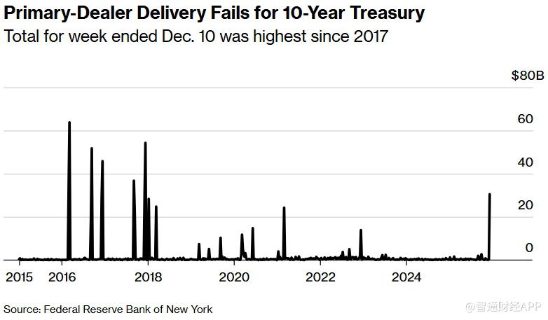 交割失败集中出现之际,正值该期10年期国债的借贷利率出现异常下滑。这一批债券源自11月12日进行的420 亿美元拍卖,在回购市场上,一些持有人愿意以负利率出借,借券方同意次日以更低价格卖回,在这种环境 下,结算失败更容易发生。 通常而言,在美债再开标前,因新增供给尚未到位,相关券种在回购市场上出现"特殊利率"并不罕见。但本次 在12月15日结算的10年期美债再开标前,市场出现的券源短缺明显"不同寻常"。 业内人士指出,关键原因之一在于美联储持有并可出借的该期美债数量明显下降。South Street Securities总裁 Jason Schuit表示:"可供出借的国债明显更少。就这只10年期国债而言,美联储本轮购买规模仅为此前三个周 期的一半,这直接造成了供给短缺,从而引发交割失败。" 受美联储自2022年以来缩减国债持仓的影响,美国国债市场近期出现明显摩擦。最新数据显示,本月10年期美 国国债的交割失败规模飙升至八年来最高水平,凸显出关键期限美债在回购市场中的供需失衡。 根据纽约联储公布的数据,截至12月10日当周,涉及最新一期10年期美债、未能按期完成结算的交易规模达到 305亿美元,为2017年12 ...
