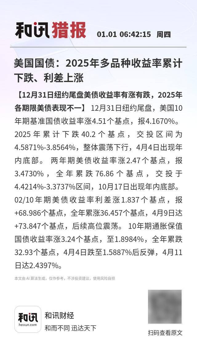日达2.4397%。 本文由 Al 算法生成,仅作参考,不涉投资建议,使用风险自担 和讯财经 hexun.co 和而不同 迅达天下 【12月31日纽约尾盘美债收益率有涨有跌,2025年各期限美债表现不一】12月31日纽约尾盘,美国10年 期基准国债收益率涨4.51个基点,报4.1670%。2025年累计下跌40.2个基点,交投区间为 4.5871%-3.8564%,整体震荡下行,4月4日出现年内底部。两年期美债收益率涨2.47个基点,报 3.4730%,全年累跌76.86个基点,交投于4.4214%-3.3737%区间,10月17日出现年内底部。02/10年期美 债收益率利差涨1.837个基点,报+68.986个基点,全年累涨36.457个基点,4月9日达+73.847个基点,后 续高位震荡。10年期通胀保值国债收益率涨3.24个基点,至1.8984%,全年累跌32.93个基点,4月4日跌 至1.5887%后反弹,4月11日达2.4397%。 本文由 AI算法生成,仅作参考,不涉投资建议,使用风险自担 扫码查看原文 ...