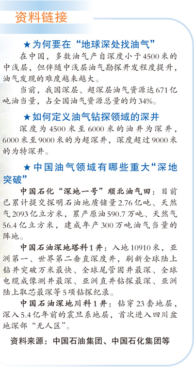 四川盆地首口万米科学探索井——中国石油深地川科1井,黄文俊摄 今年初,中国石油深地 塔科1井钻探深度突破1万米时,司钻房内的技术人员激动地欢呼,鼓掌庆祝。 四川盆地首口万米科学探索井——中国石油 深地川科1井。 黄文俊摄 今年初,中国石油深地塔科1井钻探深度突破 1万米时,司钻房内的技术人员激动地欢呼,鼓掌庆祝。 中国石油深地塔科 1井带回的万米地质资料。 金 添摄 新疆塔克拉玛干沙漠腹地,矗立着一座红白相间、20多层楼高的钻机。地下,千余根钻杆相连,钻入12 套地层,通往地球深处,这就是中国首口超万米科探井——中国石油深地塔科1井。 上天,下海,入地,被视作人类探索自然的三大壮举。"十四五"时期,中国深地工程不断取得新突破, 在钻深深度、技术装备、科学认知等领域实现跨越发展,曾经遥远的"地下珠峰",成为可及的探索前 沿,为国家能源安全提供坚实保障。 深地塔科1井刷新5项钻探纪录 完钻,10910米! 2025年2月20日,中国石油集团对外宣布,中国石油深地塔科1井胜利完钻,掘进地下10910米。 这口井位于新疆阿克苏地区沙雅县境内,是中国石油在塔里木盆地实施的重大"深地工程"。 在油气钻探领域,深度为450 ...