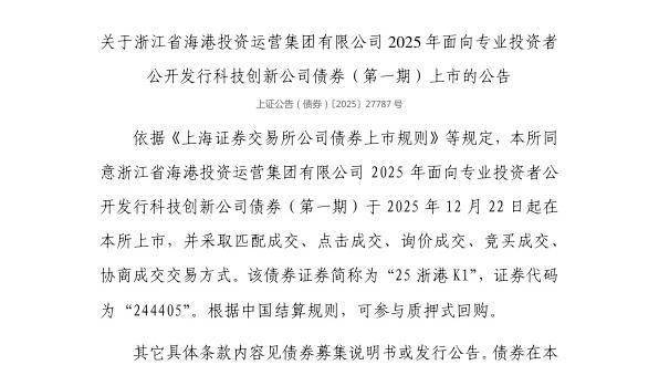 12月19日,上交所发布关于浙江省海港投资运营集团有限公司2025年面向专业投资者公开发行科技创新 公司债券(第一期)上市的公告。 来源:市场资讯 依据《上海证券交易所公司债券上市规则》等规定,上交所同意浙江省海港投资运营集团有限公司2025 年面向专业投资者公开发行科技创新公司债券(第一期)于2025年12月22日起在上交所上市,并采取匹 配成交、点击成交、询价成交、竞买成交、协商成交交易方式。该债券证券简称为"25浙港K1",证券 代码为"244405"。根据中国结算规则,可参与质押式回购。 ...