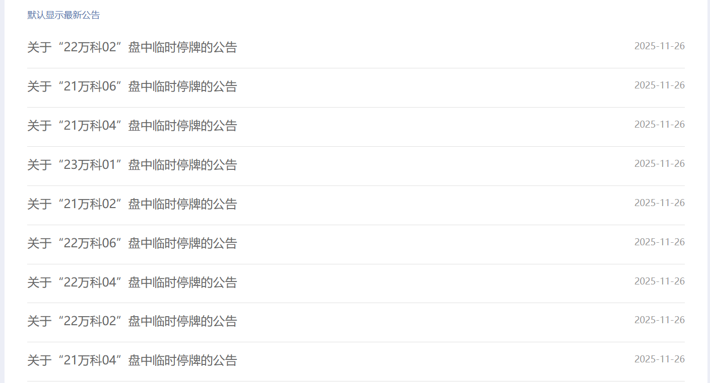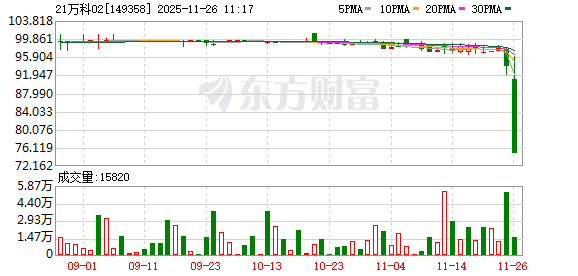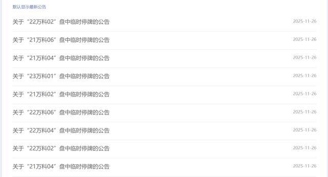 今天(11月26日),万科境内债券出现集体下挫行情。 截至发稿,"21万科02""21万科04""22万科02"等多只债券触发盘中临时停牌;此外,多只债券跌超 10%。 | 默认显示最新公告 | | | --- | --- | | 关于"22万科02"盘中临时停牌的公告 | 2025-11-26 | | 关于"21万科06"盘中临时停牌的公告 | 2025-11-26 | | 关于"21万科04"盘中临时停牌的公告 | 2025-11-26 | | 关于"23万科01"盘中临时停牌的公告 | 2025-11-26 | | 关于"21万科02" 盘中临时停牌的公告 | 2025-11-26 | | 关于"22万科06"盘中临时停牌的公告 | 2025-11-26 | | 关于"22万科04"盘中临时停牌的公告 | 2025-11-26 | | 关于"22万科02"盘中临时停牌的公告 | 2025-11-26 | | 关于"21万科04"盘中临时停牌的公告 | 2025-11-26 | 债市调整迅速传导至股市,万科股价同步承压。 而9月12日至今,港股万科企业更是从5.94港元一路下跌至近期的4港元附近。截至15 ...