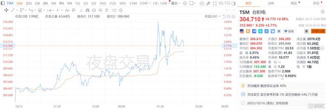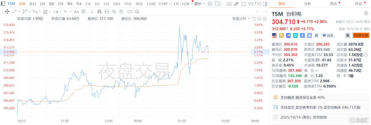 今日,台积电公布了强劲的2025年第三季度业绩,受AI芯片需求强劲推动,公司Q3净利润同比大增 39.1%,超出市场预期并创下新高。 受此影响,台积电美股夜盘拉升涨近3%,报312.96美元。 Q3净利润创纪录 | 綜合損益表項目 (除另予註明書外 · 金額為新台幣十億元) | 3Q25 | 3Q25 樂績展望 | 2Q25 | 3Q24 | 季變化 | 年慶化 | | --- | --- | --- | --- | --- | --- | --- | | 營藥收入淨額(美金十億元)。 | 33.10 | 31.8-33.0 | 30.07 | 23.50 | +10.1% | +40.8% | | 餐菓收入淨額 | 26 686 | | 933.79 | 759.69 | +6.0% | +30.3% | | 發展毛利率 | 59.5% | 55.5%-57.5% | 58.6% | 57.8% | +0.9 ppts | +1.7 ppts | | 爱紧要用 | (87.76) | | (84.51) | (79.08) | +3.9% | +11.0% | | 景景淨利率 | 50.6% | 45.5% ...