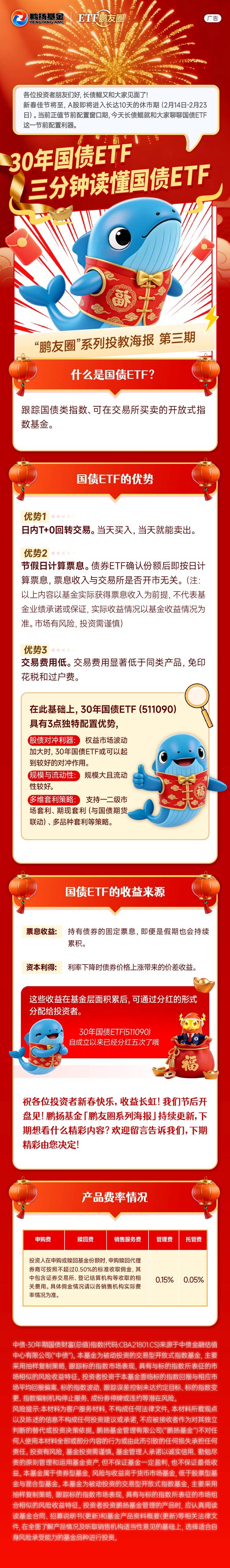 30年国债ETF近期市场表现 - 2026年2月13日早盘,30年国债ETF(511090)上涨0.14% [1] - 盘中换手率为3%,成交额为6.92亿元 [1] - 截至2月12日,该ETF近1年日均成交额为82.06亿元 [1] - 最新规模达到230.57亿元 [1] - 近6天连续获得资金净流入,合计18.72亿元,最高单日净流入6.58亿元 [1] 银行间债券市场环境 - 2月12日,中国银行间债市维持偏暖格局,利率债收益率下行,10年期国债收益率向1.77%关口靠拢 [1] - 银行间市场资金面稍有改善,DR001加权平均利率徘徊于1.36%附近 [1] - 央行当日开展1665亿元7天期逆回购操作,利率1.40%,同时开展4000亿元14天期逆回购操作 [1] - 当日有1185亿元逆回购到期,据此计算单日净投放4480亿元 [1] 市场情绪与机构观点 - 市场“持券过节”情绪明显升温,债券成为节前资金更青睐的配置方向,推动现券行情持续走强 [2] - 机构认为,临近春节假期,机构持券过节意愿较高,使得盘面呈现“偏暖而克制”的特征 [2] - 展望节后,市场焦点或回归基本面与政策节奏 [2] - 央行对国债买卖常态化的表述让长端利率更有“锚”,短期波动空间被压住,对配置盘实际比较有利 [2] 30年国债ETF产品概况 - 30年国债ETF紧密跟踪中债-30年期国债指数(总值)财富指数 [2] - 该指数成分券由在境内公开发行上市流通的发行期限为30年且待偿期25-30年的记账式国债组成,不包含特别国债 [2] 国债ETF的通用优势 - 支持日内T+0回转交易,当天买入当天可卖出 [9] - 节假日计算票息,确认份额后即按日计算票息,票息收入与交易所是否开市无关 [9] - 交易费用低,显著低于同类产品,免印花税和过户费 [9] 30年国债ETF的独特配置优势 - 可作为股债对冲利器,在权益市场波动加大时或可起到较好的对冲作用 [9] - 规模大且流动性较好 [10] - 支持一二级市场套利、期现套利(与国债期货联动)、多品种套利等多维套利策略 [10] 国债ETF的收益来源 - 票息收益:持有债券的固定票息,假期也会持续累积 [10] - 资本利得:利率下降时债券价格上涨带来的价差收益 [10] - 基金层面积累的收益可通过分红形式分配给投资者,30年国债ETF自成立以来已分红五次 [10] 产品费率情况 - 管理费率为0.15% [12] - 托管费率为0.05% [12] - 申购或赎回时,代理券商可按照不超过0.50%的标准收取佣金,其中包含相关机构收取的费用 [12]