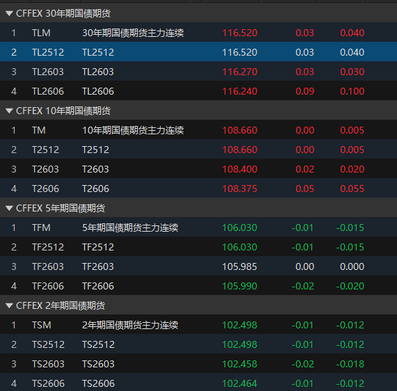 上证报中国证券网讯 11月4日,国债期货收盘涨跌互现,30年期主力合约涨0.03%,报116.520元,10年 期主力合约持平,报108.660元,5年期主力合约跌0.01%,报106.030元,2年期主力合约跌0.01%,报 102.498元。 11月4日,国债期货收盘涨跌互现,30年期主力合约涨0.03%,报116.520元,10年期主力合约持平,报 108.660元,5年期主力合约跌0.01%,报106.030元,2年期主力合约跌0.01%,报102.498元。 | | ▼ CFFEX 30年期国信期货 | | | | | | --- | --- | --- | --- | --- | --- | | 1 | TLM | 30年期国债期货主力连续 | 116,520 | 0.03 | 0.040 | | 2 | TL2512 | TL2512 | 116.520 | 0.03 | 0.040 | | 3 | TL2603 | TL2603 | 116.270 | 0.03 | 0.030 | | র্ব | TL2606 | TL2606 | 116.240 | 0.09 | 0.100 | | | ▼ ...