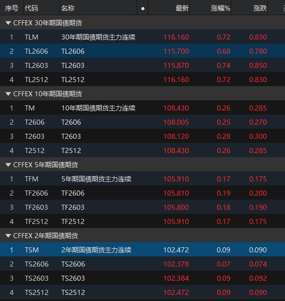 10月28日,国债期货午盘全线上涨,30年期主力合约涨0.72%,10年期主力合约涨0.26%,5年期主力合 约涨0.17%,2年期主力合约涨0.09%。 上证报中国证券网讯 10月28日,国债期货午盘全线上涨,30年期主力合约涨0.72%,10年期主力合约涨 0.26%,5年期主力合约涨0.17%,2年期主力合约涨0.09%。 | 序号 代码 | | 名称 | . | 涨幅% | | | --- | --- | --- | --- | --- | --- | | ▼ CFFEX 30年期国债期货 | | | | | | | 1 | TLM | 30年期国债期货主力连续 | 116.160 | 0.72 | 0.830 | | 2 | TL2606 | TL2606 | 115.700 | 0.68 | 0.780 | | 3 | TL2603 | TL2603 | 115.870 | 0.74 | 0.850 | | র্ব | TL2512 | TL2512 | 116.160 | 0.72 | 0.830 | | ▼ CFFEX 10年期国债期货 | | | | | | | 1 | TM | 10年期国 ...