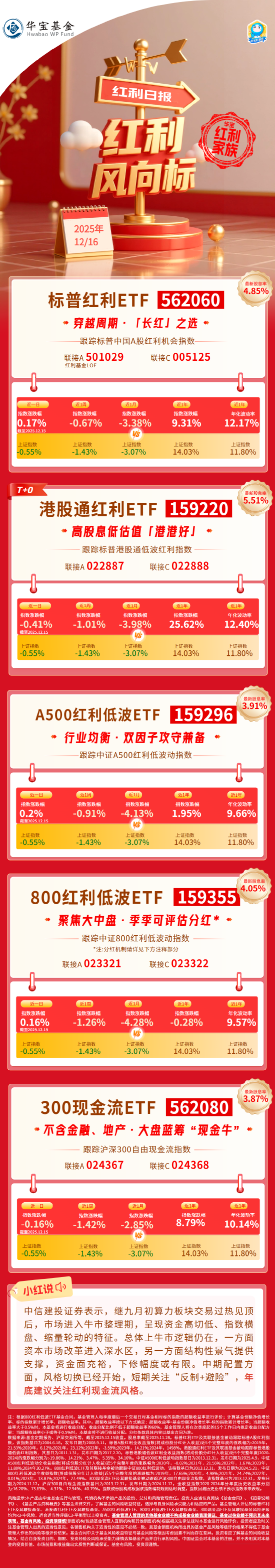 华宝基金 lwabao WP Fund 红利日报 2025年 12/16 最新股息率 4.85% 标普红利ETF 562060 * 穿越周期·「长红」之选 · 跟踪标普中国A股红利机会指数- 联接A 501029 红利基金LOF 近1周 ( 近1月 近1年 近1年 近一日 指數涨跌幅 指数涨跌幅 指数涨跌幅 指數涨跌幅 年化波动率 0.17% -3.38% 9.31% 12.17% -0.67% 般至2025.12.15 (VS) 上证指数 上证指数 上证指数 上证指数 上证指数 11.80% -0.55% -1.43% -3.07% 14.03% T+0 最新股息率 5.51% 巷股通红利ETF 159220 官 即自 但 十 倍 【 注 送 亿 】 "同权屈阶口但「佗它灯」 " -跟踪标普港股通低波红利指数 - 联接A 022887 (近1月) 近一日 (近1周) (近1年) 近1年 指數涨跌幅 指數涨跌幅 指数涨跌幅 指數涨跌幅 年化波动率 -0.41% -1.01% -3.98% 25.62% 12.40% 般至2025.12.15 (VS) 上证指数 上证指数 上证指数 上证指数 上证指数 -0.5 ...