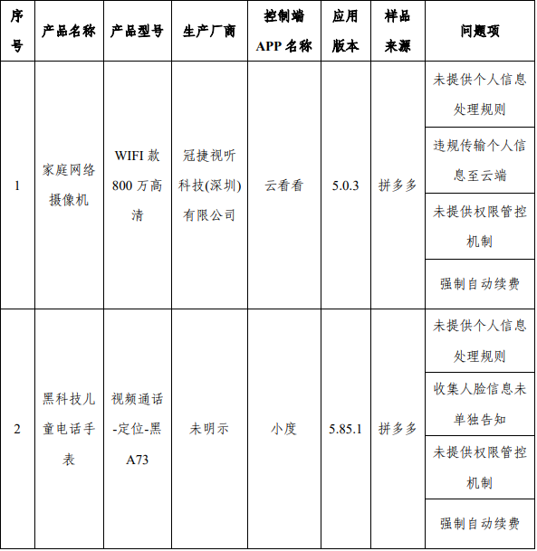 | 序 | 产品名称 | 产品型号 | 生产厂商 | 控制端 | 应用 | 样品 | 问题项 | | --- | --- | --- | --- | --- | --- | --- | --- | | 島 | | | | APP 名称 | 版本 | 来源 | | | | 家庭网络 | WIFI 款 | 冠捷视听 | | | | 未提供个人信息 处理规则 | | | | | | | | | 违规传输个人信 | | 1 | | 800 万高 | 科技(深圳) | 云看看 | 5.0.3 | 拼多多 | 息至云端 | | | 摄像机 | 清 | 有限公司 | | | | 未提供权限管控 | | | | | | | | | 机制 | | | | | | | | | 强制自动续费 | | 2 | 黑科技儿 童电话手 表 | 视频通话 -定位-黑 A73 | 未明示 | 小度 | 5.85.1 | 拼多多 | 未提供权限管控 | | | | | | | | | 未提供个人信息 处理规则 | | | | | | | | | 收集人脸信息未 | | | | | | | | | 单独告知 | | | | | | | | | 机 ...