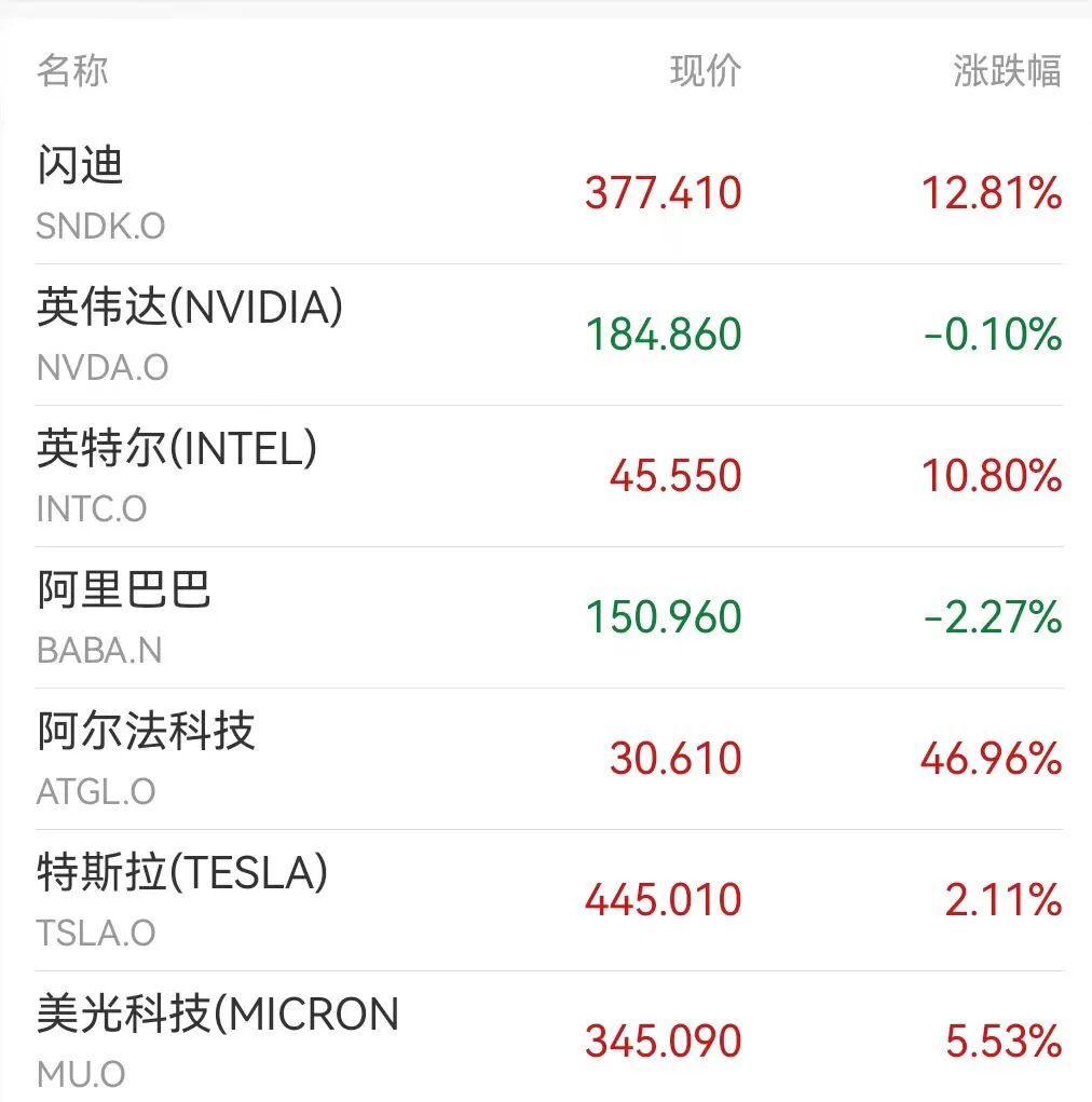 美股芯片股,集体大涨! 当地时间周五,美股三大指数全线上涨,标普500指数收盘创新高。存储芯片、半导体板块集体大涨。其中, 闪迪大涨超12%,股价再创历史新高。自去年4月下旬以来,闪迪股价累计涨幅超过1100%。 其他个股方面,周五当天,英特尔涨超10%,拉姆研究涨近9%,应用材料、西部数据涨近7%,阿斯麦涨超 6%,美光科技涨超5%,博通涨近4%。 再创新高!闪迪股价大幅拉升 野村证券在给客户的一份报告中写道:"渠道调查显示,多家存储供应商持续推高产品价格,其中企业级 NAND的涨幅尤为激进。闪迪用于企业级SSD的NAND产品据称在本季度环比涨幅可能超过100%。"野村证券 将涨价归因于两方面因素:一是短期供应短缺,二是受人工智能(AI)整体发展推动的中期需求增长,特别 是AI存储架构的变化。 野村证券的报告提到,英伟达是这一轮闪存芯片涨价的主要推手。英伟达的推理上下文内存存储平台 (ICMSP)是今年企业级存储需求的重要驱动因素之一。该平台基于BlueField-4 DPU,并配备一块512GB SSD,用于承载KV缓存。在VR NVL144机架中,每一个计算托盘都配备了一颗带有512GB硬盘的BlueF ...