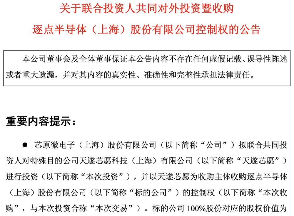 芯原股份(688521.SH)公告,公司拟联合共同投资人对特殊目的公司天遂芯愿科技(上海)有限公司("天遂 芯愿")进行投资,并以天遂芯愿为收购主体收购逐点半导体(上海)股份有限公司("标的公司")的控制权。 标的公司100%股份对应的股权价值为9.5亿元。为保障本次收购的顺利实施,天遂芯愿预计将以不超过 9.5亿元现金作为交易对价加上交易费用等相关费用收购标的公司的控制权。2025年10月15日,天遂芯 愿与标的公司股东、标的公司等相关方签署《股份购买协议》,约定以9.3亿元现金加上交易费用等相 关费用收购标的公司97.89%股份。本次交易完成后,天遂芯愿将持有标的公司100%的股份,标的公司 将纳入公司合并报表范围。 据公告所示,标的公司专注于移动设备视觉处理芯片、视频转码芯片和3LCD投影仪主控芯片及实施方 案的开发和设计,是全球先进的创新视频、显示处理芯片和解决方案提供商。作为智能手机AI独立显 示芯片引领者,标的公司拥有160多项国内外发明专利。标的公司的手机视觉处理芯片已成功进入主流 手机厂商的供应链,可根据不同产品的市场定位,提供硬件、软件、IP、算法及软硬件一体的视觉处理 方案。标的公司首创的 ...