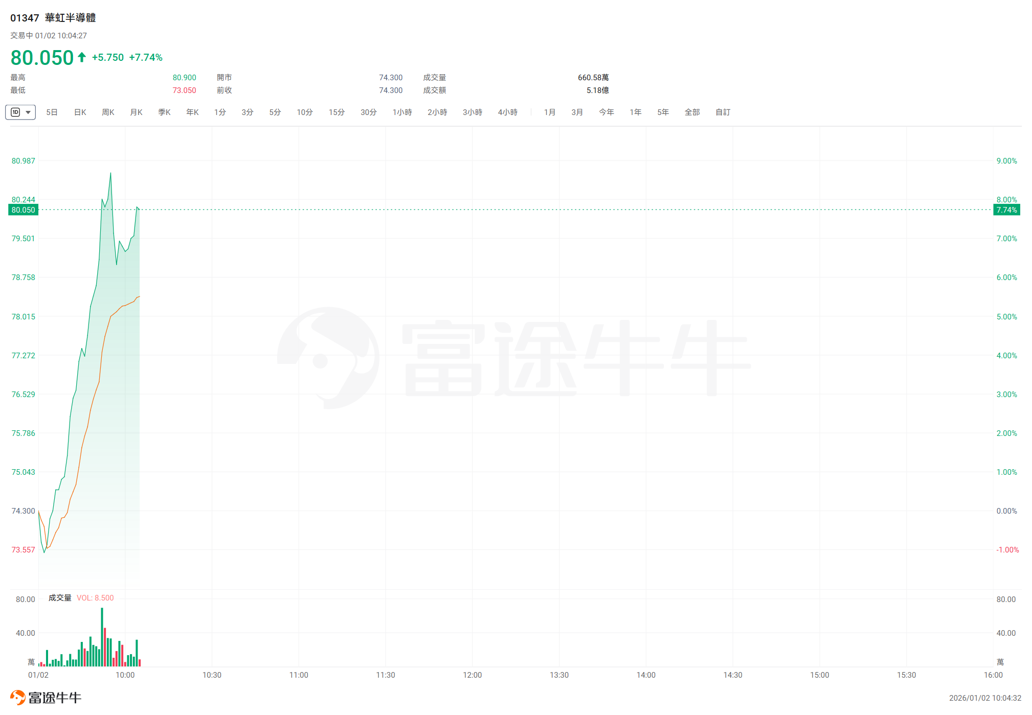 此次交易聚焦双方重合的65/55nm、40nm工艺节点对应的业务与资产,交易完成后将解决历史形成的同 业竞争问题,优化公司治理结构与业务独立性,符合监管要求与资本市场预期。作为特色工艺平台覆盖 最全面的晶圆代工企业,华虹公司通过此次整合将直接纳入华力微的12英寸晶圆代工生产线与成熟工艺 平台,公司产能规模将实现持续增长。 华虹半导体(01347)拉升逾8%,截至发稿,涨7.54%,报79.9港元,成交额3.89亿港元。 消息面上,华虹半导体发布多份公告表示,公司拟通过发行股份方式向华虹集团等4名交易对方购买其 合计持有的华力微97.4988%股权,并拟向不超过35名符合条件的特定对象发行股票募集配套资金。此 次交易对价为82.68亿元人民币,拟配套募集资金75.56亿元人民币。 ...
