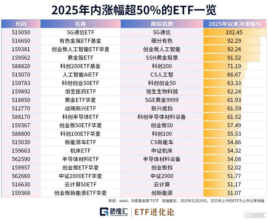 历史的车轮滚滚向前,大多时候它只是匀速碾过岁月的尘埃,但总有某些特殊的年份,它会突然加速。 2025年正是加速切换轨道的一年。 这不仅是数字的跃升,更是投资范式的根本性改变——ETF已成为投资者必不可少的工具。 透过ETF的涨跌幅与资金流,能清晰地触摸到2025年市场的温度和资金流向。 翻开2025年的成绩单,一片红火的数字背后是情绪的集中释放。 这一年的起笔显得格外厚重。年初,DeepSeek-R1横空出世,以不足OpenAI十分之一的训练成本震动全球,英伟达单日市值蒸发近6000亿美元,中国AI第 一次以破局者的姿态站到了牌桌中央。 随后,人形机器人走出实验室;中国创新药管线数量登顶全球第一;揽月着陆器完成验证,我们目光已望向更深远的星辰大海... 当实体经济的技术革命与全球资本的流向发生共振,一场资产定价的重估悄然展开。 ETF作为最敏锐的市场温度计,忠实地记录了这一年中国资产从悲观犹豫到气势如虹的逆转。 01 6万亿!迈入新时代 2025年,中国ETF市场正式迈入6万亿时代。 从年初的3.73万亿到如今的6万亿,中国ETF市场规模增长2.27万亿,增幅60.86%。1385只ETF产品如同敏锐的触角, ...