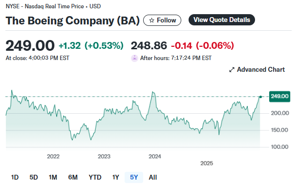 公司新领导层的上任似乎已稳定了业务,并使其走上了复苏之路。波音公司预计将于2026年实现七年来 的首次年度盈利。在4月份关税恐慌期间股价一度跌破137美元后,该股的反弹表明投资者认可管理层的 决策。 Westwood投资组合经理Ben Chittenden表示:"管理团队出色地带领公司摆脱了危机,实现了扭亏为 盈。"他指出,强劲的订单和季度自由现金流转正尤其提振了投资者的信心。 该公司正在加紧生产737飞机,同时努力解决制造质量问题以及阻碍员工发现问题的企业文化。去年, 美国监管机构批准波音公司将737飞机的月产量提高到42架,取消了面板事故后设定的每月38架的产量 上限。 智通财经APP获悉,波音公司(BA.US)股价已抹去了自2年前事故以来的所有跌幅,这表明投资者对首席 执行官凯利·奥特伯格领导下的公司复苏越来越有信心。该股周二上涨0.5%,收于249美元。2024年1月5 日,该股也以同样的价格收盘,几个小时后,阿拉斯加航空运营的一架波音飞机在飞行途中,一块门大 小的客机门塞掉落。事故发生后的15个月里,该股暴跌了45%。 自2019年以来,波音股价经历了过山车般的波动。当年3月,波音股价创下历史新高, ...