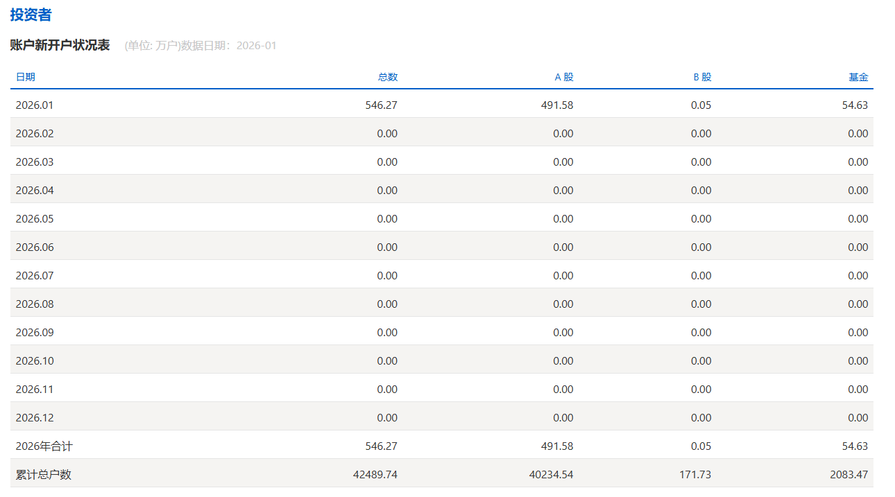 2026年1月A股新开户数据核心观点 - 2026年1月A股市场投资者开户意愿出现爆发式增长,新开A股账户数达491.58万户,环比大幅增长89%,同比2025年1月的157.0万户更是激增213% [1] 新开户数据详细分析 - **月度开户总量**:2026年1月,上海证券交易所新开股票账户总数为546.27万户,其中A股账户为491.58万户,B股账户仅为0.05万户 [2] - **年度累计与历史存量**:截至2026年1月,当年累计新开户总数即为546.27万户(A股491.58万户,B股0.05万户)[2] 1月数据公布后,上海证券交易所累计股票账户总数达到42,489.74万户,其中A股累计账户数为40,234.54万户,B股累计账户数为171.73万户 [2]