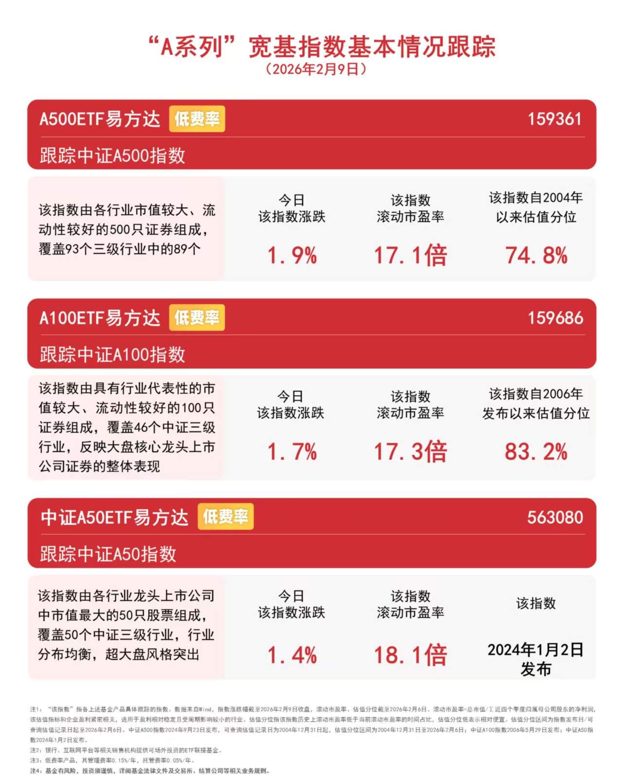 市场表现与指数数据 - 截至收盘,中证A500指数上涨1.9% [1] - 截至收盘,中证A100指数上涨1.7% [1] - 截至收盘,中证A50指数上涨1.4% [1] 机构市场观点 - 中信建投证券认为,当前外部扰动未对中国产业基本面形成实质性冲击且集中降温操作已结束,市场情绪充分释放,调整较为到位 [1] - 中信建投证券认为,春节后春季行情有望延续 [1] 中证A500指数及相关产品 - A500ETF易方达跟踪中证A500指数,该指数由各行业市值较大、流动性较好的500只证券组成,覆盖93个三级行业中的89个 [3] - 该指数当前滚动市盈率为17.1倍 [3] - 该指数自发布以来估值分位数处于74%的水平 [3] 中证A50指数特征 - 中证A50指数由各行业龙头上市公司中市值最大的50只股票组成,覆盖50个中证三级行业 [5] - 该指数行业分布均衡,超大盘风格突出 [5] - 该指数当前滚动市盈率为18.1倍 [5]