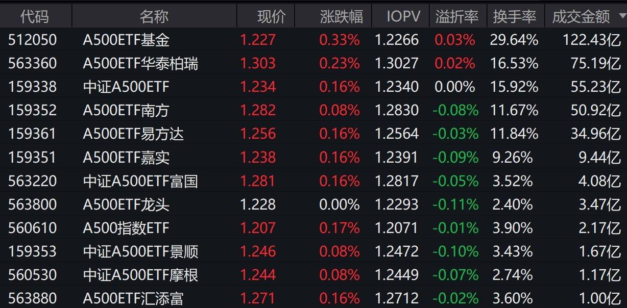 市场整体表现 - 市场早盘探底回升,三大指数集体翻红,中证A500指数上涨0.22% [1] - 有券商观点认为,短期政策面、资金面、汇率等因素对股市的支撑仍在,春季行情下半场或暂时以震荡上行为主 [1] 行业板块动向 - 化工板块集体走强 [1] - 人形机器人概念表现活跃 [1] - 有色金属板块回暖 [1] - 大消费板块集体下挫,其中白酒、旅游酒店方向跌幅居前 [1] 中证A500指数ETF表现 - 截至上午收盘,场内多只跟踪中证A500指数的ETF小幅上涨 [1] - 有12只中证A500相关ETF成交额超过1亿元,其中2只超过75亿元 [1] - A500ETF基金早盘成交额为122.43亿元,A500ETF华泰柏瑞早盘成交额为75.19亿元 [1] - A500ETF基金现价1.227元,上涨0.33%,IOPV为1.2266元,溢折率0.03% [2] - A500ETF华泰柏瑞现价1.303元,上涨0.23%,IOPV为1.3027元,溢折率0.02%,换手率16.53% [2] - 中证A500ETF现价1.234元,上涨0.16%,IOPV为1.2340元,溢折率0.00%,换手率15.92% [2] - A500ETF南方现价1.282元,上涨0.08%,IOPV为1.2830元,溢折率-0.08%,换手率11.67% [2] - A500ETF易方达现价1.256元,上涨0.16%,IOPV为1.2564元,溢折率-0.03%,换手率11.84% [2] - A500ETF嘉实现价1.238元,上涨0.16%,IOPV为1.2391元,溢折率-0.09%,换手率9.26% [2] - 中证A500ETF富国现价1.281元,上涨0.16%,IOPV为1.2817元,溢折率-0.05%,换手率3.52% [2] - A500ETF龙头现价1.228元,IOPV为1.2293元,溢折率-0.11%,换手率2.40% [2] - A500指数ETF现价1.207元,上涨0.17%,IOPV为1.2071元,溢折率-0.01%,换手率3.90% [2] - 中证A500ETF景顺现价1.246元,上涨0.08%,IOPV为1.2472元,溢折率-0.10%,换手率3.43% [2] - 中证A500ETF摩根现价1.244元,上涨0.08%,IOPV为1.2449元,溢折率-0.07%,换手率2.74% [2] - A500ETF汇添富现价1.271元,上涨0.16%,IOPV为1.2712元,溢折率-0.02%,换手率3.60% [2]