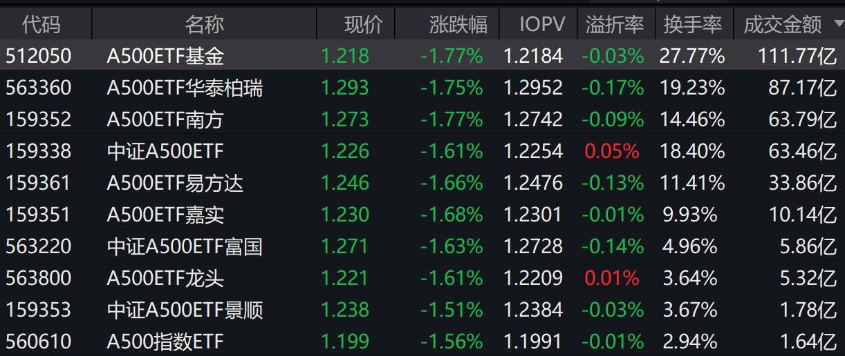 市场早盘震荡调整,中证A500指数下跌1.59%,2只中证A500相关ETF成交额超87亿元