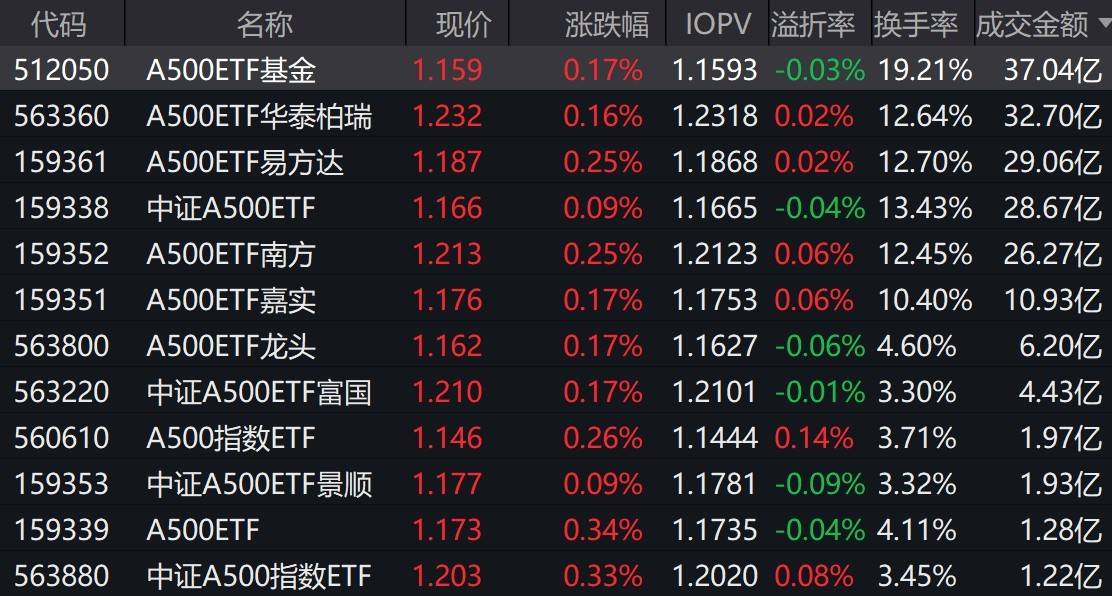 截至上午收盘,场内跟踪中证A500指数的ETF小幅下跌。其中,有12只中证A500相关ETF成交额超1亿元,3只超31亿元。A500ETF华泰柏瑞、A500ETF基 金、A500ETF易方达早盘成交额分别为35.89亿元、34.06亿元、31.61亿元。 | 有券商表示,短期内,由于A股自身运行逻辑未发生根本改变,海外市场对大盘影响相对有限,叠加上证指数在4000点附近震荡消化多时,指数层面下探空 | | --- | | 间也相对有限,市场连续调整到位后可适当逢低布局。 | 每日经济新闻 市场早间冲高回落,深成指、沪指先后翻绿,中证A500指数下跌0.01%。 盘面上,军工板块表现活跃,银行板块走强,化工板块盘中拉升。下跌方面,影视、传媒板块走弱。 | 代码 | 名称 | 现价 | 涨跌幅 | IOPV 溢折率 筷号率 成交金额 | | | --- | --- | --- | --- | --- | --- | | 563360 | A500ETF华泰柏瑞 | 1.225 | -0.24% | 1.2261 -0.09% 13.89% | 35.89 Z | | 512050 | A500ETF基金 | 1. ...