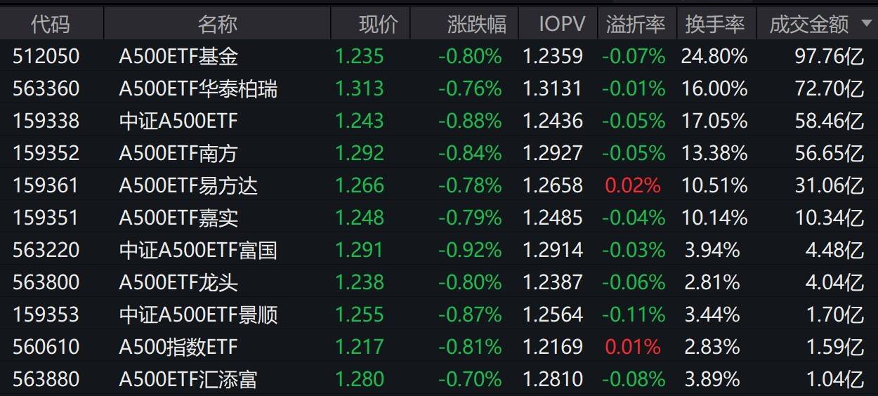 市场早盘震荡调整,中证A500指数下跌1.41%,2只中证A500相关ETF成交额超89亿元
