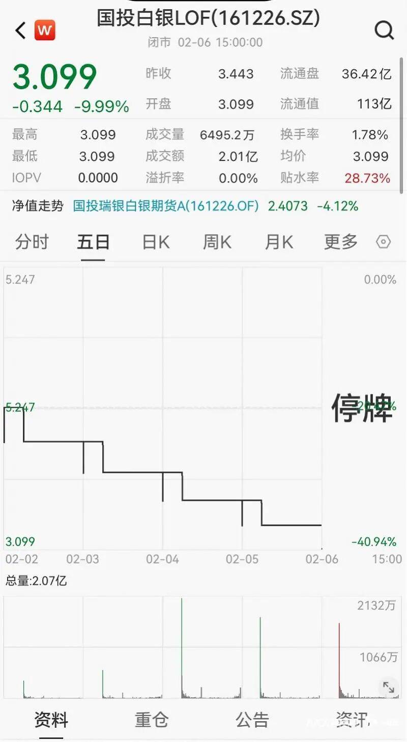 事件概述 - 国投瑞银基金于2月6日发布公告,集中回应旗下白银(LOF)基金因估值调整引发的市场争议,并积极回应投资者诉求 [1] 公司回应与措施 - 公司明确将践行以投资者为本,秉持依法公开原则,努力降低估值调整对投资者的影响 [1] - 公司已成立专门工作小组,研究制定相关方案,支持投资者通过和解、调解、仲裁等方式解决诉求 [1] - 公司将积极支持和解、调解、仲裁的有效执行,并表示有能力保障投资者的合法权益 [1] - 公司表示将持续遵循依法合规、尽职履责的经营原则,在基金运作、估值等环节坚持公允定价,公平保护全体投资者 [1] - 公司高度重视并尊重每一位投资者,将继续通过热线电话、官方邮件等方式与投资者积极沟通 [1] 估值调整事件详情 - 争议源于国投瑞银基金于2月2日晚间对旗下白银LOF的估值调整操作 [1] - 公司决定自2月2日起,对基金持有的AG2604、AG2605、AG2606、AG2608、AG2610、AG2612共6只白银期货合约调整估值计算规则 [1] - 估值调整导致基金净值剧烈波动:A类份额单位净值从调整前一交易日的3.2838元骤降至2.2494元,C类份额从3.2621元降至2.2290元,两类份额单日跌幅均达31.5% [1] - 公司解释选择盘后发布公告的原因是,担心提前发布会被市场解读为有意引导投资者不要赎回,进而推测基金资产流动性出现严重问题,引发市场恐慌甚至基金挤兑 [2] 市场表现与影响 - 受估值调整事件持续影响,2月2日至6日期间,国投白银LOF场内价格连续5个交易日出现“一字跌停” [2] - 该基金单周累计大跌40.94%,最新场内价格报3.099元/份 [2] - 截至2月6日收盘,国投白银LOF(161226.SZ)场内价格为3.099元,较昨日收盘价3.443元下跌0.344元,跌幅9.99% [3] - 当日该基金开盘价、最高价、最低价均为3.099元,成交量为6495.2万份,成交额为2.01亿元,换手率为1.78% [3] - 该基金当日IOPV(基金份额参考净值)为0.0000,溢折率为0.00%,贴水率为28.73% [3] - 其净值走势显示,国投瑞银白银期货A(161226.OF)净值为2.4073元,当日下跌4.12% [3]