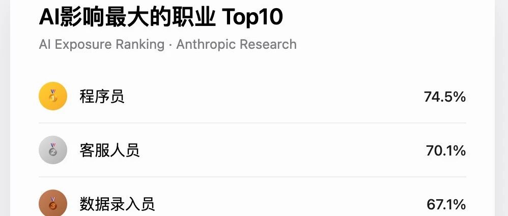 AI对劳动力市场的理论影响与实际应用现状 - AI在众多知识型行业已具备很高的理论能力覆盖率,但企业和个人的实际使用率仍然很低,AI的潜力远未完全释放 [2] - 理论能力覆盖(蓝色)与实际使用覆盖(红色)之间存在显著差距 [5] 受AI影响最显著的职业分析 - 目前AI影响程度最高的职业是程序员,其工作有高达74.5%的任务理论上可由AI参与完成 [8][10] - 客服人员以70.1%的实际暴露率位列第二,数据录入员以67.1%位列第三 [8][10][11] - 受AI影响较大的前十职业还包括医疗记录管理(66.7%)、市场研究与营销(64.8%)、销售代表(62.8%)、金融与投资分析师(57.2%)、软件测试(51.9%)、信息安全分析师(48.6%)和IT技术支持(46.8%) [10][11] - 这些高度数字化、文本化的工作最容易受到AI参与或自动化 [8] 程序员成为AI影响榜首的深层原因 - 程序员的工作本质上是结构化语言,代码具有高度结构化、规则清晰、训练数据巨大三个特点,这正好是大语言模型最擅长的领域 [17][23] - AI已能完成程序员的许多日常工作,例如编写函数、修复bug、编写测试、生成文档、生成SQL以及编写脚手架代码 [18][23] - 开发者越来越多地让AI编写代码,而人只负责审查,程序员正变得越来越像代码审稿人 [18][19] AI对行业效率与成本结构的影响 - AI在提高工作效率的同时,也带来了人员优化的副作用 [12][13] - 公司的成本结构可能发生变化,从“租用程序员”转向“购买Token” [14] - 尽管目前Token成本可能高于程序员,但预计未来会越来越便宜 [15] - 存在一种观点认为,雇佣大学生可能更具成本效益,因为他们不仅工资较低,还可能自费购买Token并使用AI为公司工作 [16] 相对不易受AI影响的职业类型 - 最不容易被AI影响的职业几乎都是体力劳动,例如厨师、机械维修、救生员、酒吧调酒师和园林工人 [20][24] - 原因在于AI目前还无法执行如修理水管等物理性任务,尽管未来机器人技术可能改变这一状况 [21] AI对行业门槛与工作模式的重塑 - AI改变的不是职业本身,而是行业的准入门槛和工作模式 [22] - 过去,一个普通程序员只是团队的一份子;现在,一个普通程序员借助AI几乎可以完成过去一个团队的工作量 [24] - 这导致顶级开发者会变得更强,而普通开发者将面临更激烈的竞争 [25] - 技术行业一直处于变化中,每一次技术革命都会淘汰一批不愿学习新工具的人 [26] - 历史上的工具革命,如从汇编到C、从C到Java、从Java到Python、从IDE到Copilot再到AI Agent,都遵循同一规律:让普通人变强,让强者更强 [27][28] - 核心问题并非AI是否会取代工作,而是当AI成为默认工具时,个人或公司是否选择使用它 [28]