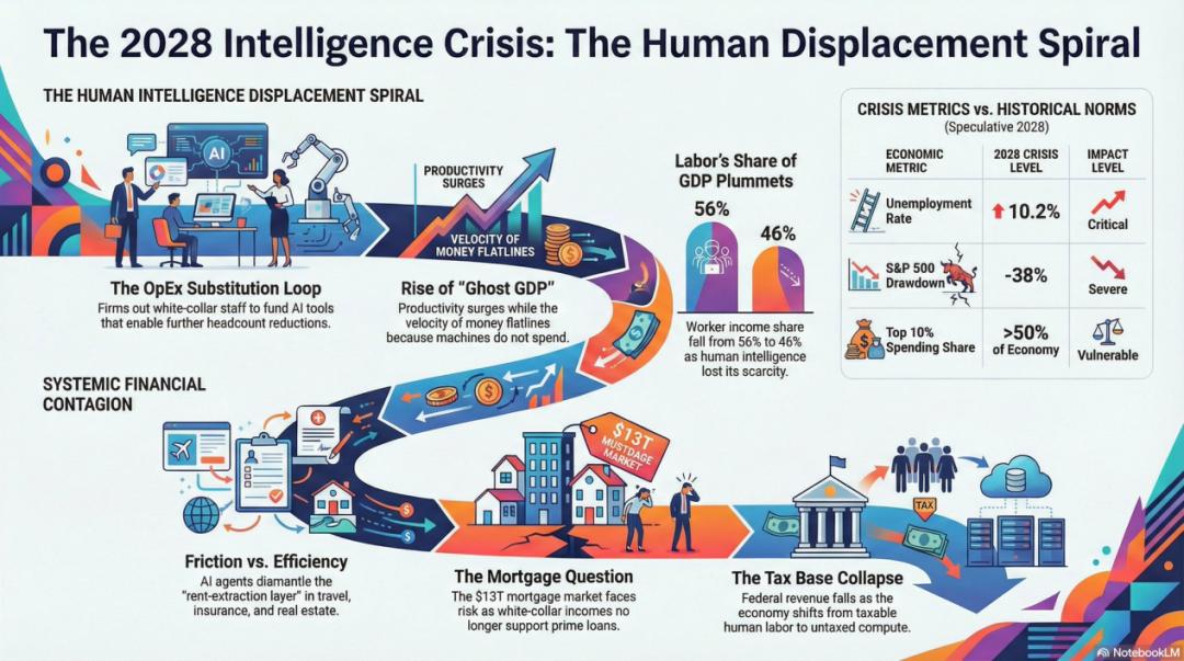 核心观点 - 这是一份来自未来的思想实验报告,核心论点是:如果AI的能力持续超预期地提升,但未能转化为广泛的人类收入增长,反而导致大规模白领失业和消费萎缩,那么全球经济可能陷入一场由“智能过剩”引发的“智能通缩危机” [1][4][7][16] 市场与宏观经济表现 - **市场先扬后抑**:在2026年10月,市场处于狂热状态,标普500指数接近8000点,纳斯达克指数突破30000点 [6][13][47] - **经济数据分化**:名义GDP呈现中高个位数的年化增长,生产率(每小时实际产出)以1950年代以来未见的速度飙升,但主要由不眠不休的AI代理驱动 [14][47] - **危机爆发**:到2028年,失业率升至10.2%,标普500指数从2026年10月的高点累计回撤38% [11][46] - **核心矛盾**:AI能力和市场表现超出预期,但实体经济(尤其是占GDP 70%的、以人为中心的消费经济)却陷入萎缩,出现了“幽灵GDP”——计入国民账户但未在真实经济中循环的产出 [16][48] 危机传导机制:负反馈循环 - **循环起点**:AI能力提升,导致企业用AI替代白领员工,利润率扩大,股价上涨 [13][47] - **循环加剧**:企业将创纪录的利润再投资于AI算力,进一步提升了AI替代人的能力。被取代的白领收入骤降,消费减少,给企业带来新的利润压力,迫使它们进行更多AI投资和裁员 [6][17][48] - **循环结果**:形成一个没有自然刹车的“人类智能失业螺旋”,白领的收入能力和消费支出被结构性削弱 [17][18][48] 行业影响:软件与SaaS - **颠覆开端**:2025年末,AI编程工具(如Claude Code、Codex)能力跃升,使开发者能在数周内复制中端SaaS产品的核心功能,动摇了企业续费意愿 [22][50] - **定价权丧失**:企业采购时开始利用自研选项作为谈判筹码,导致SaaS合同续签价格承受巨大压力,例如有财富500强公司以30%的折扣续约 [23][50] - **龙头公司受冲击**:以ServiceNow为例,其客户因AI裁员导致ServiceNow的许可证被取消,形成反身性。ServiceNow的净新增年度合同价值增长从23%减速至14%,公司随后宣布裁员15%并将资金投入AI以自救 [25][26][52] - **行业逻辑改变**:受AI威胁最严重的公司成为了AI最积极的采用者,通过裁员和投资AI来维持生存,这与历史上 incumbent 抵制新技术的模式不同 [27][28][52] 行业影响:中介与平台经济 - **根本性破坏**:AI代理消除了基于人类惰性、时间有限性和信息不对称的“摩擦”,威胁所有依赖“中间商赚差价”的商业模式 [32][37][54] - **订阅经济**:AI代理自动管理并优化订阅,打击了依赖客户惰性被动续费的商业模式,导致客户生命周期价值下降 [33][54] - **零工经济平台**:以DoorDash为例,AI编程工具降低了开发配送应用的门槛,导致市场碎片化。同时,AI代理作为消费者,没有“主屏幕应用忠诚度”,会实时比价所有平台,选择最快最便宜的选项,使平台的 habitual intermediation 护城河失效 [39][40][56] - **支付行业**:AI代理为优化成本,在机器间交易中转向使用手续费极低(几分之一美分)的稳定币(如通过Solana)。万事达卡在2027年Q1财报中提及“代理主导的价格优化”导致购买量增长放缓,股价单日下跌9% [42][43][44][57] - **专业服务业**:财务咨询、报税、常规法律工作等以“替客户处理繁琐事务”为核心价值的行业受到冲击,因为AI代理不觉得任何事繁琐 [34][55] - **房地产**:AI代理能瞬间获取MLS数据和历史交易信息,打破了信息不对称,导致买方佣金中位数从2.5-3%被压缩至不足1%,无人类买方代理的交易比例上升 [35][36][55] 金融体系风险 - **抵押贷款市场**:美国13万亿美元的优质抵押贷款市场建立在白领持续高收入的假设上。白领收入的结构性受损,动摇了该市场的基石 [18][48] - **信用风险传导**:私募股权通过收购保险公司等“永久资本”持有的资产,底层可能包含了受AI颠覆的SaaS公司垃圾债,风险通过金融系统层层嵌套,最终可能由普通理财用户承担 [6][48] 社会与政策困境 - **就业结构冲击**:技术革命首次出现AI不仅能替代旧工作,还能胜任新创造的工作,导致人类就业机会净减少 [6] - **政策滞后**:政府应对措施迟缓,公众对政府救援能力的信心下降,缺乏全面计划可能加速通货紧缩螺旋 [21][49] - **系统性难题**:当AI创造大量不经过人类分配也不纳税的“幽灵GDP”,而人类集体返贫时,整个经济循环系统面临重新设计的根本性挑战 [6][48]