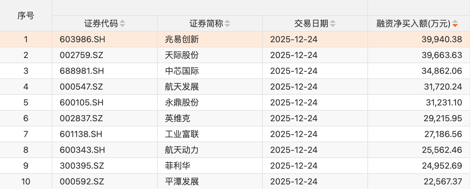 截至12月24日,A股两融余额为25416.83亿元,再创历史新高,较上一交易日增加101.2亿元,占A股流通市值比例为2.59%。当日两融交易额为2075.22亿 元,较上一交易日减少101.62亿元,占A股成交额的10.92%。 上证报中国证券网讯(刘禹希 记者 徐蔚)截至12月24日,A股两融余额为25416.83亿元,再创历史新高,较上一交易日增加101.2亿元,占A股流通市值比例 为2.59%。当日两融交易额为2075.22亿元,较上一交易日减少101.62亿元,占A股成交额的10.92%。 资金流向方面,申万31个一级行业中有20个行业获融资净买入,其中,电子行业获融资净买入额居首,当日净买入23.6亿元;获融资净买入居前的行业还有 有色金属、电力设备、机械设备、国防军工、通信等。 个股方面,43只个股获融资净买入额超1亿元。兆易创新获融资净买入额居首,净买入3.99亿元;融资净买入金额居前的还有天际股份、中芯国际、航天发 展、永鼎股份、英维克、工业富联、航天动力、菲利华、平潭发展等。 | 序号 | | | | | --- | --- | --- | --- | | | 证券代码 = | 证券简称 ...